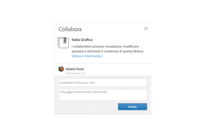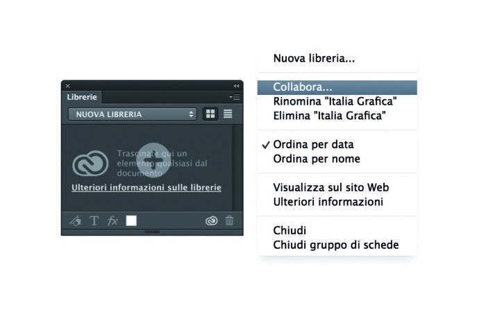 Con l’aggiornamento di dicembre le Librerie hanno acquisito la non trascurabile caratteristica di essere condivisibili con uno o più collaboratori, che vanno invitati tramite l’apposito comando «Collabora» nel menu del pannello, oppure dalla voce Condividi sulla pagina Web dei propri Asset 6.