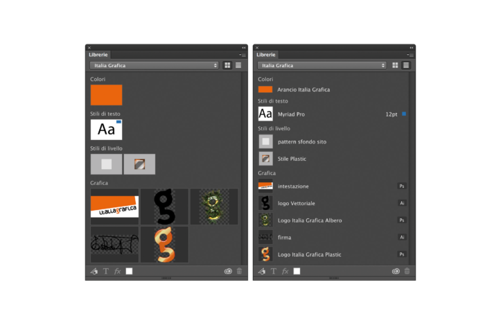Ogni elemento visualizzato nella modalità elenco riporta sulla destra il simbolo dell’applicazione da cui è stato importato, di modo che si sappia preventivamente cosa succederà importandolo nel documento di lavoro quando si lavora in Photoshop o quando si lavora in Illustrator.
