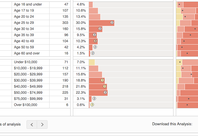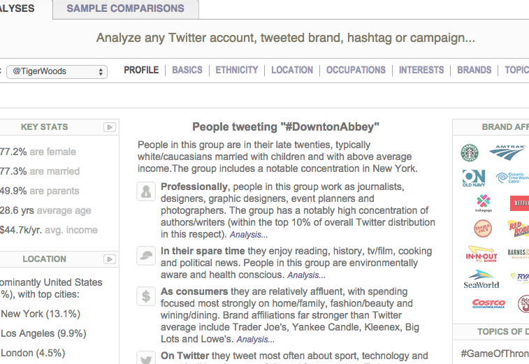 Demographics Pro è un’app molto particolare e decisamente interessante: consente di approfondire la conoscenza strategica della nostra community attraverso dati molto approfonditi sulle demografiche, sui comportamenti e sulle abitudini di acquisto dell’audience: viene per questo definita come «la Nielsen di Twitter». Tramite Demographics Pro possiamo ottenere moltissime informazioni strategiche, come nell’esempio riferito all’Hashtag #DowntonAbbey: ci fornisce report molto approfonditi su reddito, fascia d’età, abitudini di acquisto, profili demografici e psicografici delle audience che utilizzano la specifica Hashtag scelta come oggetto d’analisi 4 e e perfino il reddito di chi usa una specifica #Hashtag 5.