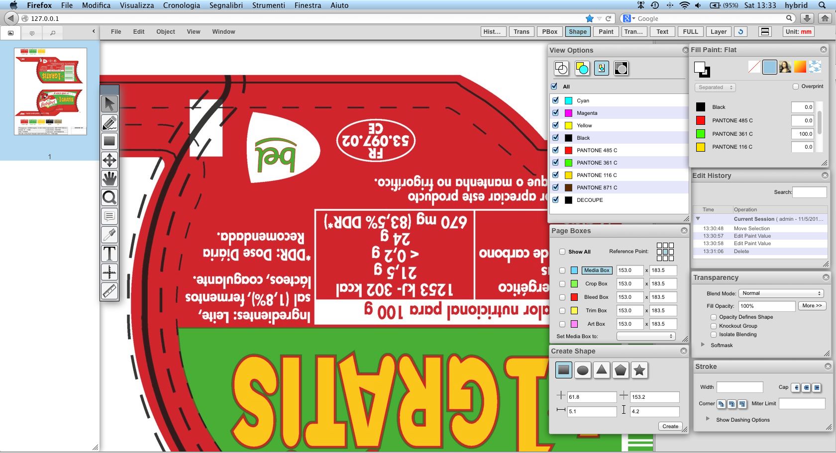 La proposta di Hybrid software è sicuramente innovativa; non è un applicativo che si installa ma funziona dentro a un browser ed è pensato come ambiente collaborativo tra cliente e fornitore di servizi di stampa. Il flusso di lavoro ipotizzato è molto semplice. Il PDF che deve essere controllato o stampato viene ricevuto dal fornitore che, via browser dopo aver inserito login e password, si collega al server ove gira l’applicazione e carica il file. Da quel momento l’editor è attivo e l’operatore può iniziare a intervenire sul file con una serie completa di strumenti. ProofScopeLive consente di personalizzare il tavolo di lavoro, abilitando o mascherando tutti i comandi a disposizione, adotta le stesse scorciatoie da tastiera di Adobe Illustrator e ha una gestione multi-pagina. La gestione del testo è completa: è possibile caricare i font forniti dal cliente e, soprattutto, ogni testo presente nel PDF è reso editabile come in un software di impaginazione. Il testo fluisce all’interno del blocco di pertinenza, può essere spostato su un livello a parte consentendo una gestione multi-lingua più semplice.