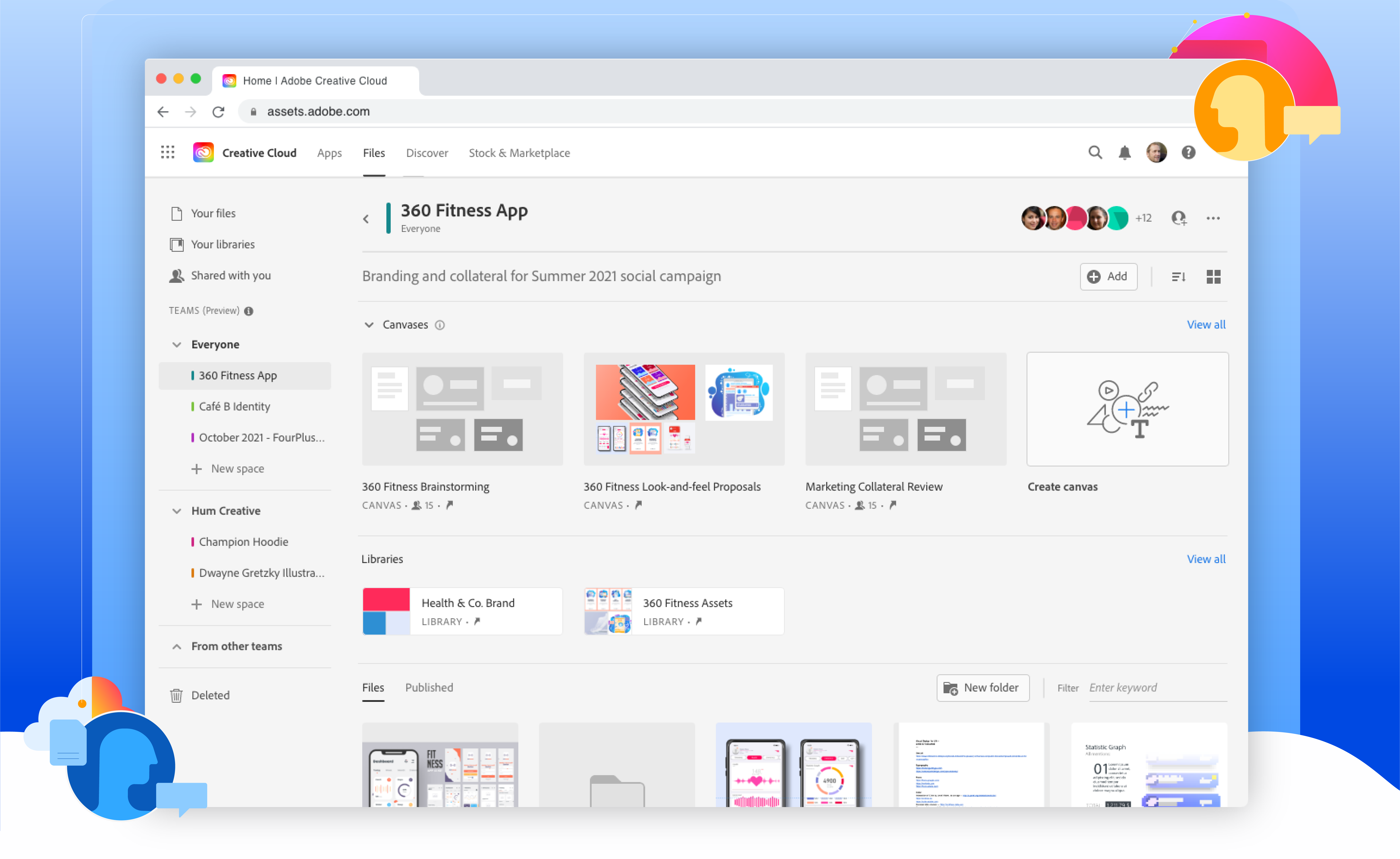 La funzione Creative Cloud Spaces offre dei repository condivisi in cui tutti i membri del team possono accedere e organizzare file, librerie e link, in modo da poter gestire facilmente l’accesso e la collaborazione in una posizione centrale, chiaramente virtuale.