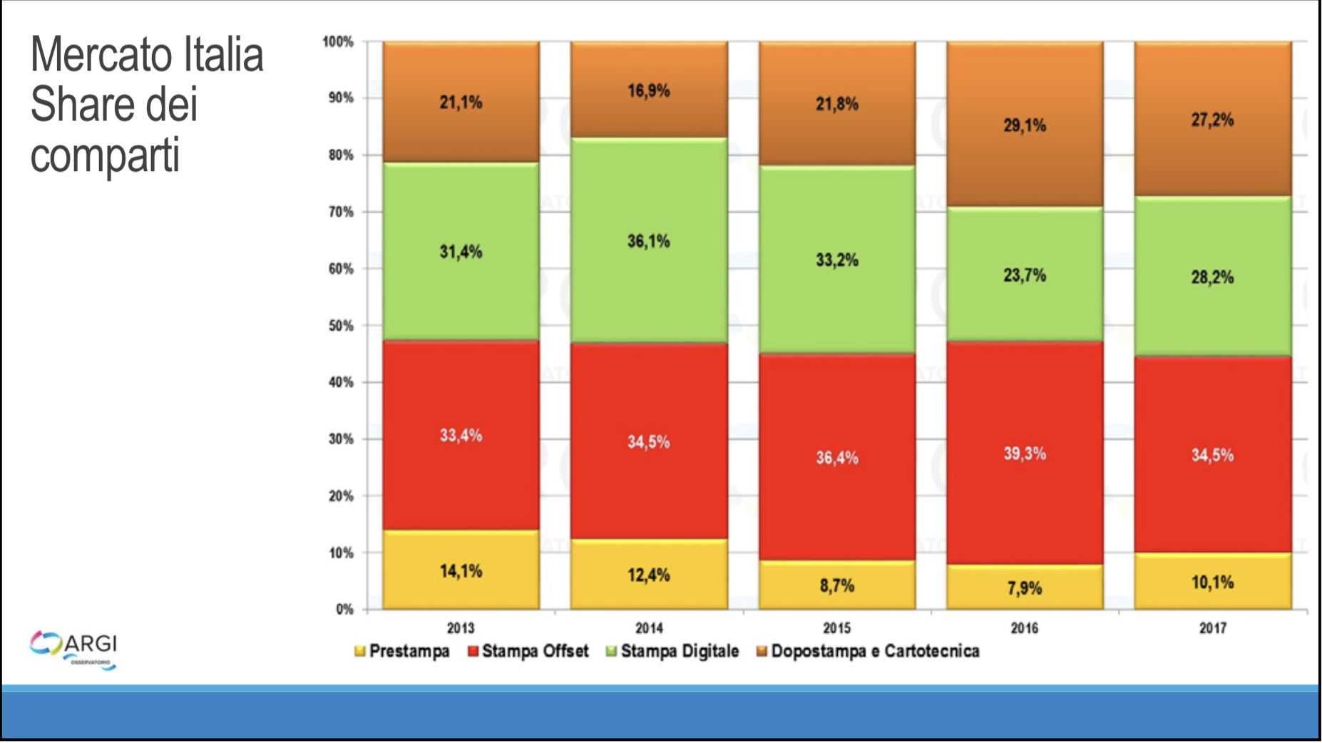 I dati più interessanti riguardano le principali aree di mercato: prestampa, stampa offset, stampa digitale e dopostampa/cartotecnica; va detto che per il settore dell’allestimento i dati non offrono un quadro completo perché è ancora esiguo il numero di aziende associate ad Argi che operano in quel ambito.