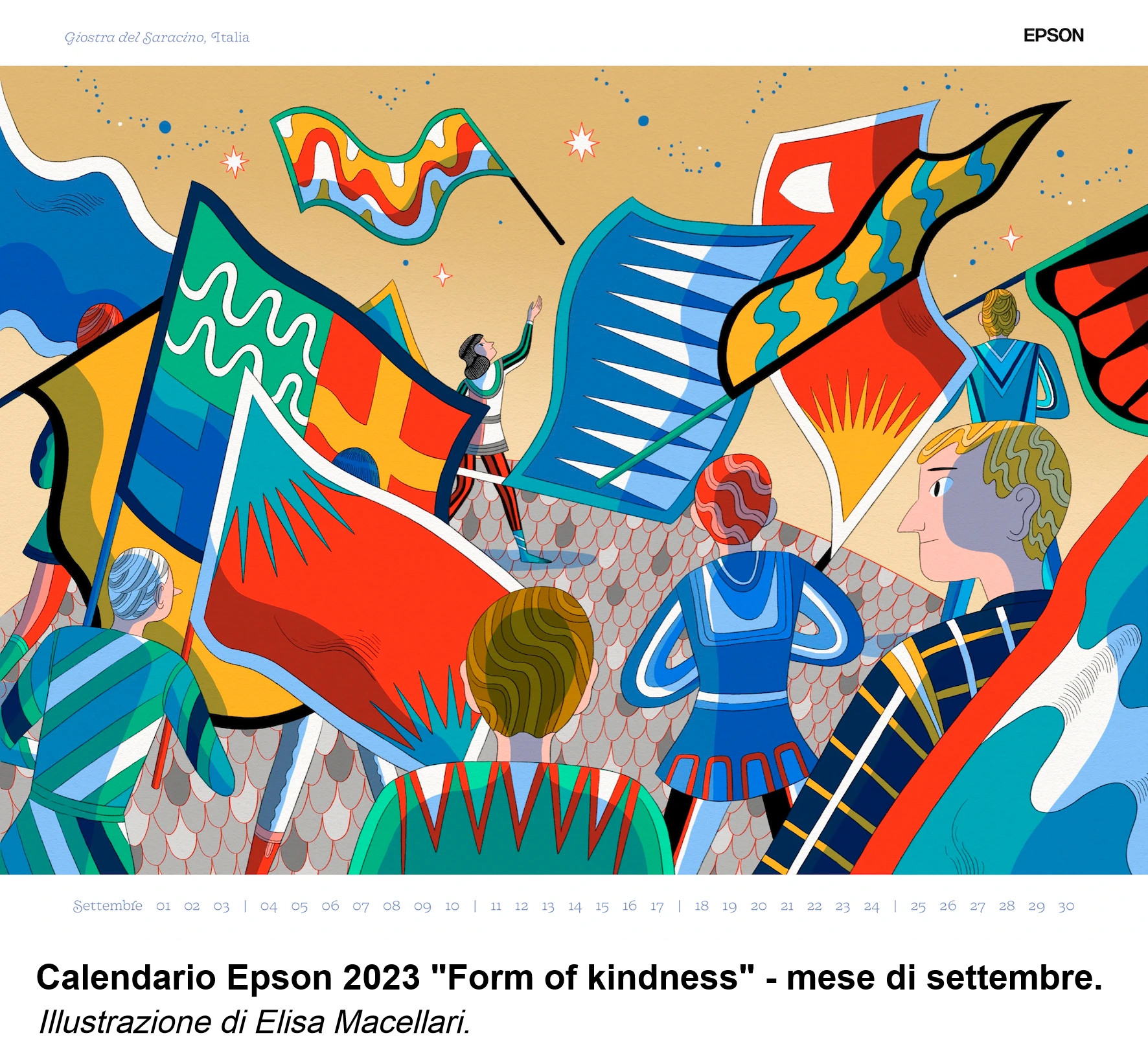 “Elisa Macellari – commenta Gianluca Folì, art director della Collana dei Calendari Epson dedicata all’illustrazione – interpreta la terza edizione del Calendario Epson con il suo linguaggio ricercato, esotico, contemporaneo. È un viaggio che passa attraverso grandi eventi mondani sparsi per il mondo, ma che al contempo sono uniti da un unico elemento. Questo elemento che sa scorrere nel tempo, Elisa ci invita a cercarlo, grazie al sapiente uso cromatico e al ritmato segno narrativo, scoprendolo finalmente nel dettaglio che sta dietro ogni persona, ogni evento, ogni elemento della composizione: la gentilezza”.