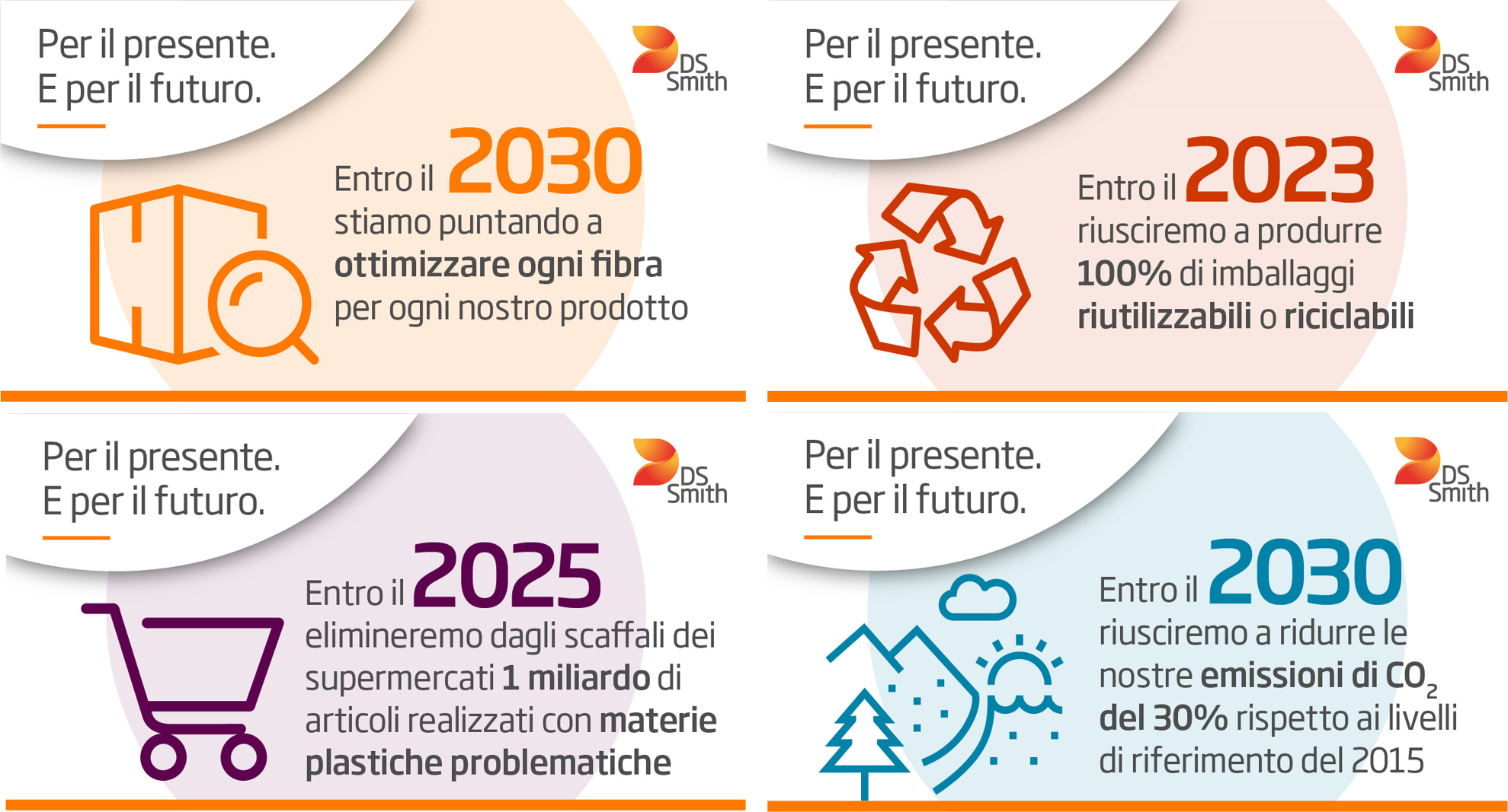 Attraverso il suo approccio innovativo Per il Presente e per il Futuro a due fasi, DS Smith continuerà a concentrarsi sulla transizione verso un’economia circolare collaborando con clienti, comunità, governi e opinion leader per favorire il riciclo e rigenerare i sistemi naturali. Continuerà a concentrarsi sulla riduzione di CO₂, proteggendo la biodiversità e riducendo il consumo di acqua.