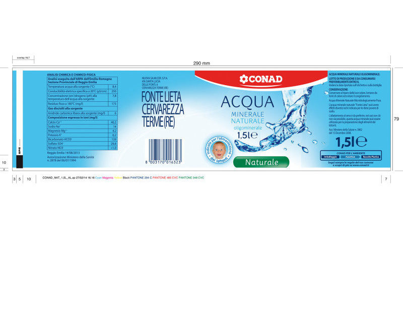 «No, si tende a uniformare il più possibile grafiche, contenuti, codici a barre, ovviamente nel rispetto della differenziazione del prodotto, per esempio l’etichetta dell’Acqua minerale naturale Lieta Conad imbottigliata in S.A.Mi.Cer. e l’etichetta dell’Acqua minerale naturale Flaminia Conad imbottigliata a Nocera Umbra non sono intercambiabili.»