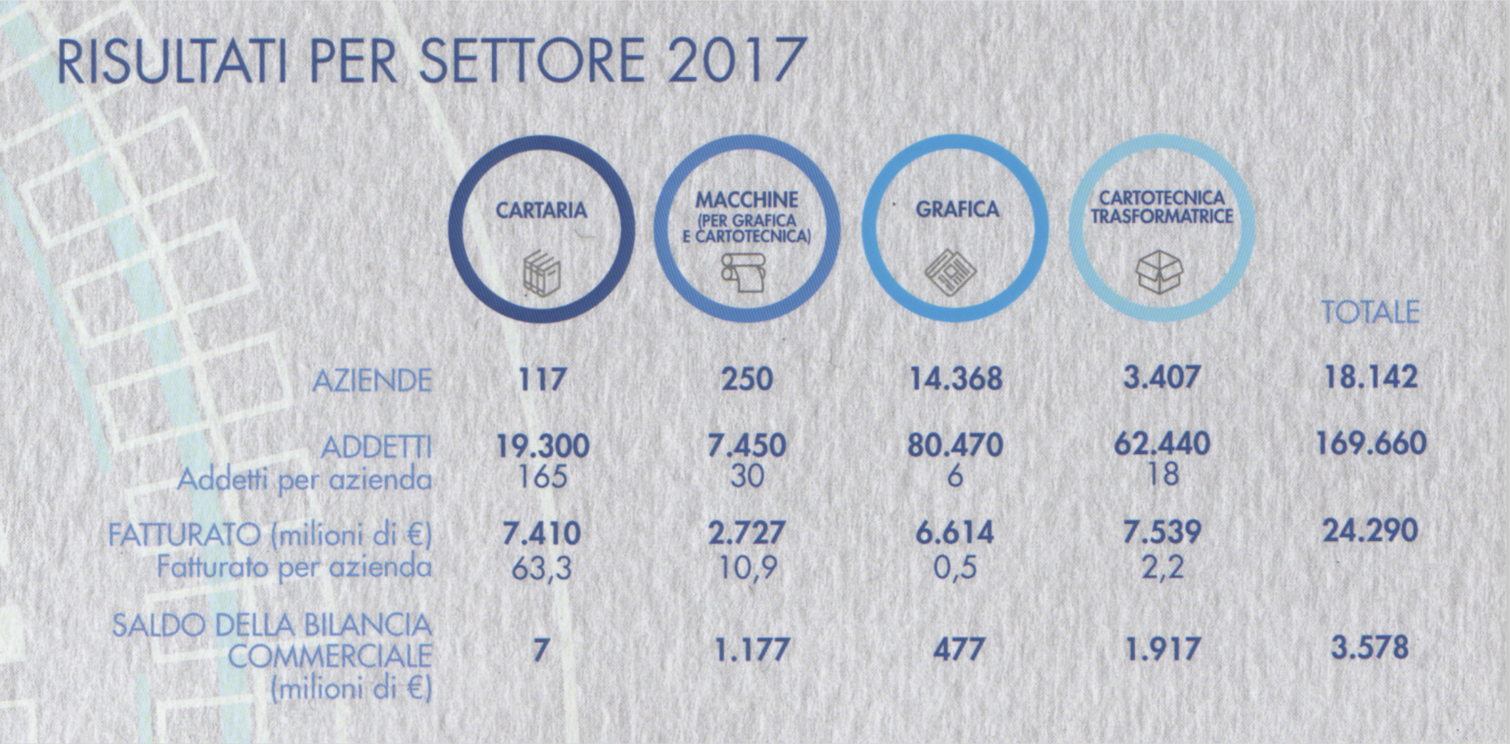 Positivi gli andamenti del settore cartario (+5,9% in valore con 7,4 miliardi di euro di fatturato), del comparto macchine per grafica e cartotecnica (+8,7% in valore e un fatturato di 2,7 miliardi di euro) e dell’industria cartotecnica e trasformatrice (+2,6% in valore e 7,5 miliardi di euro di fatturato); mentre continua la propria fase recessiva il settore grafico (-3,5% in valore con 6,6 miliardi di euro di fatturato) pur mostrando con l’inizio del 2018 i primi segnali di miglioramento.