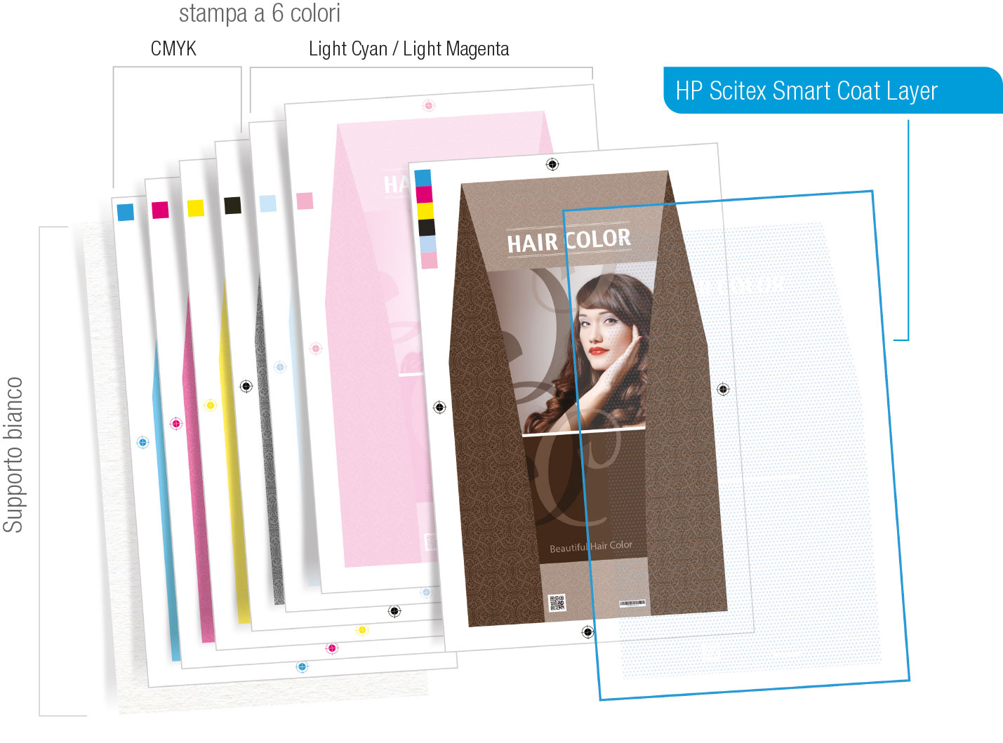 HP Scitex Smart Coat Technology è un’innovativa tecnologia di deposizione dell’inchiostro che può eliminare la necessità di un processo extra di verniciatura che comprometterebbe la flessibilità della produzione limitando la gamma di applicazioni. Quando la funzionalità è attiva, viene stampato un ulteriore livello di inchiostro, che protegge quelli sottostanti.