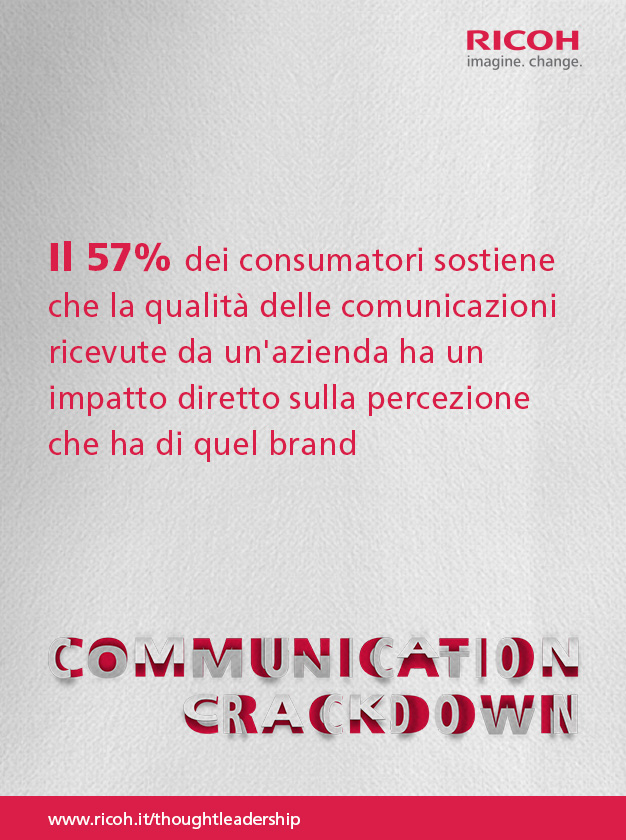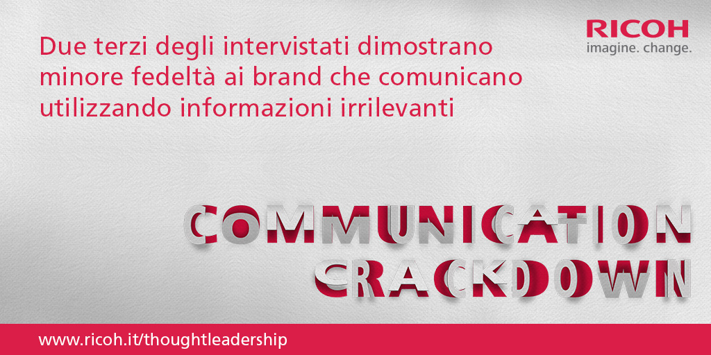 David Mills, CEO di Ricoh Europe, commenta: «I consumatori stanno dimostrando una chiara insoddisfazione nei confronti della quantità e dell’irrilevanza delle comunicazioni inviate da aziende e fornitori di servizi. Oggi, nell’era digitale, è molto semplice comunicare in modo immediato con i clienti, ma i brand devono fare molta attenzione a non compromettere l’efficacia dei canali di comunicazione. Di fronte al rischio di pesanti sanzioni e con i consumatori sempre pronti a rivolgersi altrove, è fondamentale comunicare nel modo corretto e nel momento più opportuno. In un ambiente sempre più competitivo, caratterizzato dall’emergere di ambiziose start-up e dalle crescenti aspettative dei consumatori, la qualità e la personalizzazione delle comunicazioni, digitali e cartacee, sono di importanza cruciale».