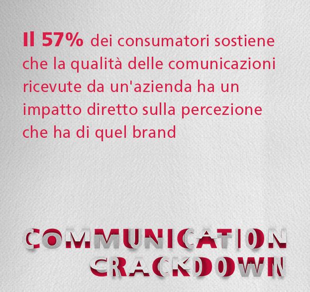Le comunicazioni non mirate, online e cartacee, vengono accolte in modo negativo da oltre due terzi dei consumatori, che valutano come spazzatura ben un quarto dei messaggi ricevuti. Sei consumatori su dieci considerano le e-mail spam peggio del tempo perso ogni giorno negli spostamenti casa-lavoro. L’84% del campione d’indagine si dichiara quindi disposto ad agire nei confronti delle aziende che non cambieranno il modo di comunicare.