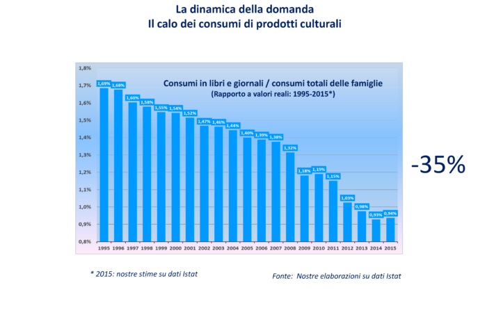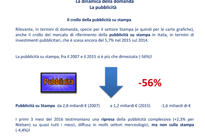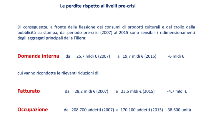 Dal lato della domanda, fra 2007 e 2015, i consumi di prodotti culturali (libri e giornali) si sono ridotti del 35%, scendendo sotto l’1% della spesa complessiva delle famiglie italiane, mentre gli investimenti pubblicitari sulla stampa si sono più che dimezzati (-56%)! Questo in un paese, l’Italia, che sta al terzultimo posto UE per tassi di lettura. Per questo la Federazione ha proposto al Governo due iniziative di politica fiscale, per stimolare i consumi di prodotti culturali e la pubblicità sulla stampa: poter detrarre dalla dichiarazione dei redditi le spese per l’acquisto di libri e prevedere la detassazione della pubblicità incrementale.