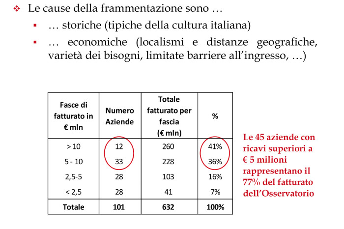 Secondo l’Osservatorio Economico (dati 2015) presentato da Federico Visconti e Gianluca Cinti, in Italia il settore appare in crescita, una crescita accompagnata a un aumento di marginalità per le imprese. Un valore che non è tradotto in maggiore indebitamento – spiega Gianluca Cinti – ma che, al contrario, può costituire ritorni interessanti investendo nel settore. Da cause storiche, tipiche della cultura italiana ed economiche (localismi e distanze geografiche), la nostra è un’industria ancora frammentata, sebbene matura, ma ancora radicata sul mercato interno e probabilmente alla ricerca di nuove condizioni di equilibrio.