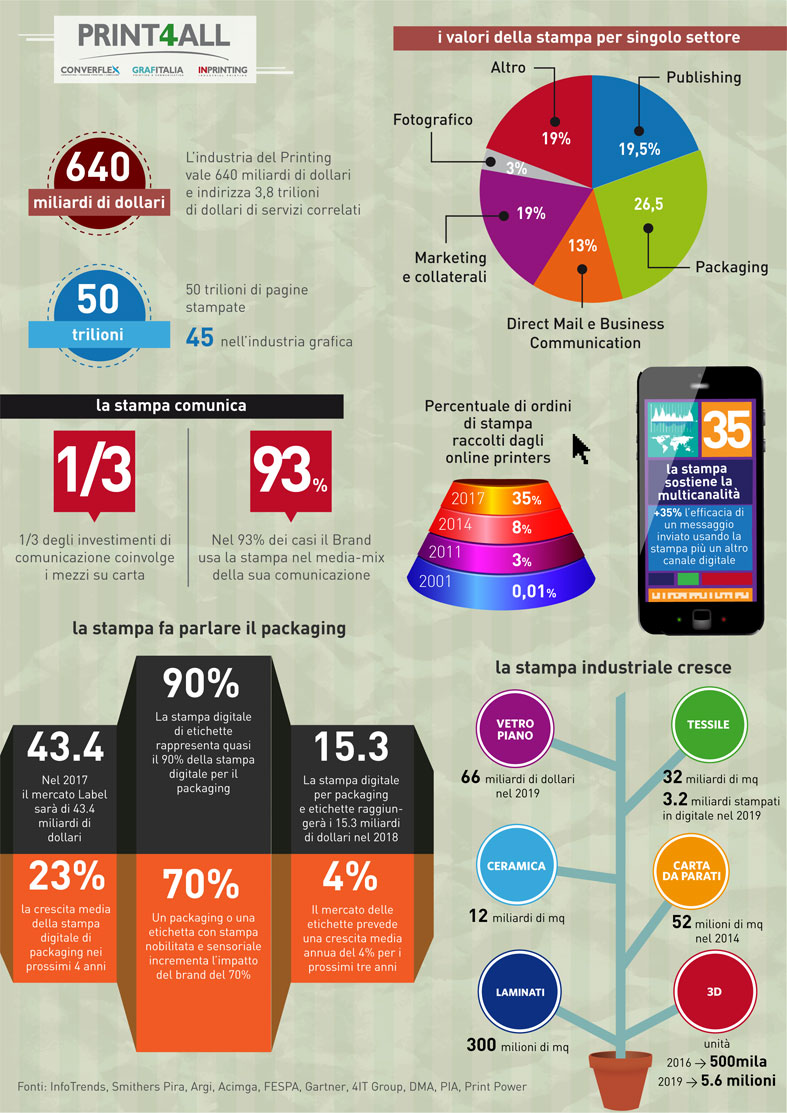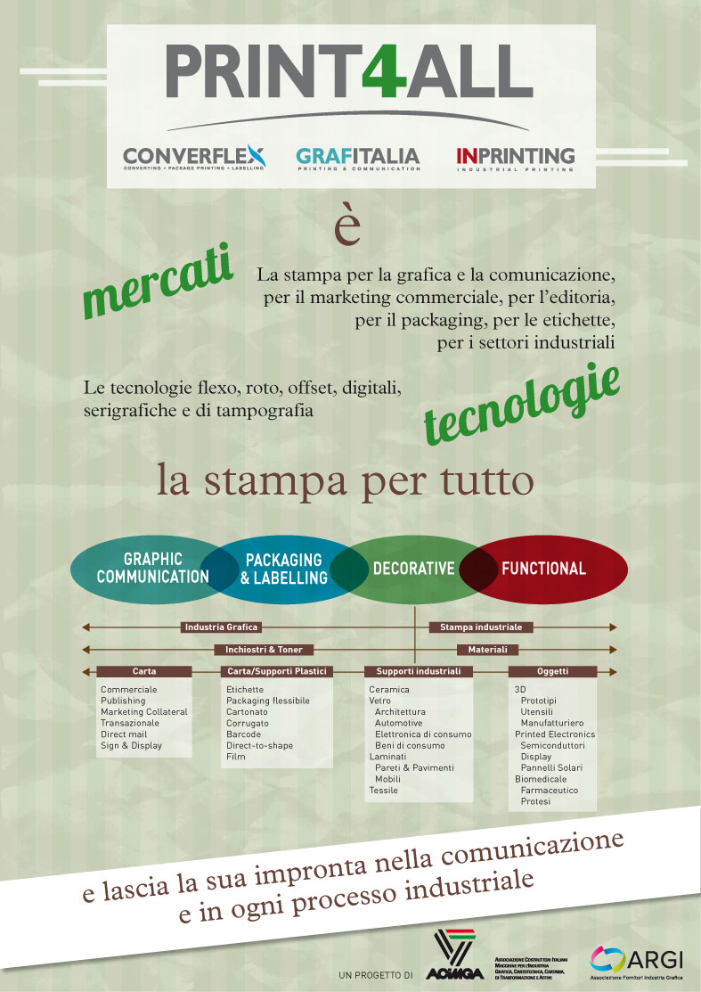 Per questo motivo si è deciso di mettere sotto il cappello di Print4All, manifestazione alla sua prima edizione dedicata a printing, converting e stampa industriale, che raccoglie l’eredità e rinnova la proposta di Converflex, Grafitalia e Inprinting. Organizzata da Fiera Milano, è di proprietà di Acimga (Associazione dei Costruttori Italiani di Macchine per l’Industria Grafica, Cartotecnica, Cartaria, di Trasformazione e Affini) e Argi (Associazione Fornitori Industria Grafica). La stampa per tutto (letterale): le tecnologie flexo, roto, offset, digitali, serigrafiche e di tampografia. La stampa per la grafica e la comunicazione, per il marketing commerciale, per l’editoria, per il packaging, per le etichette, per i settori industriali.