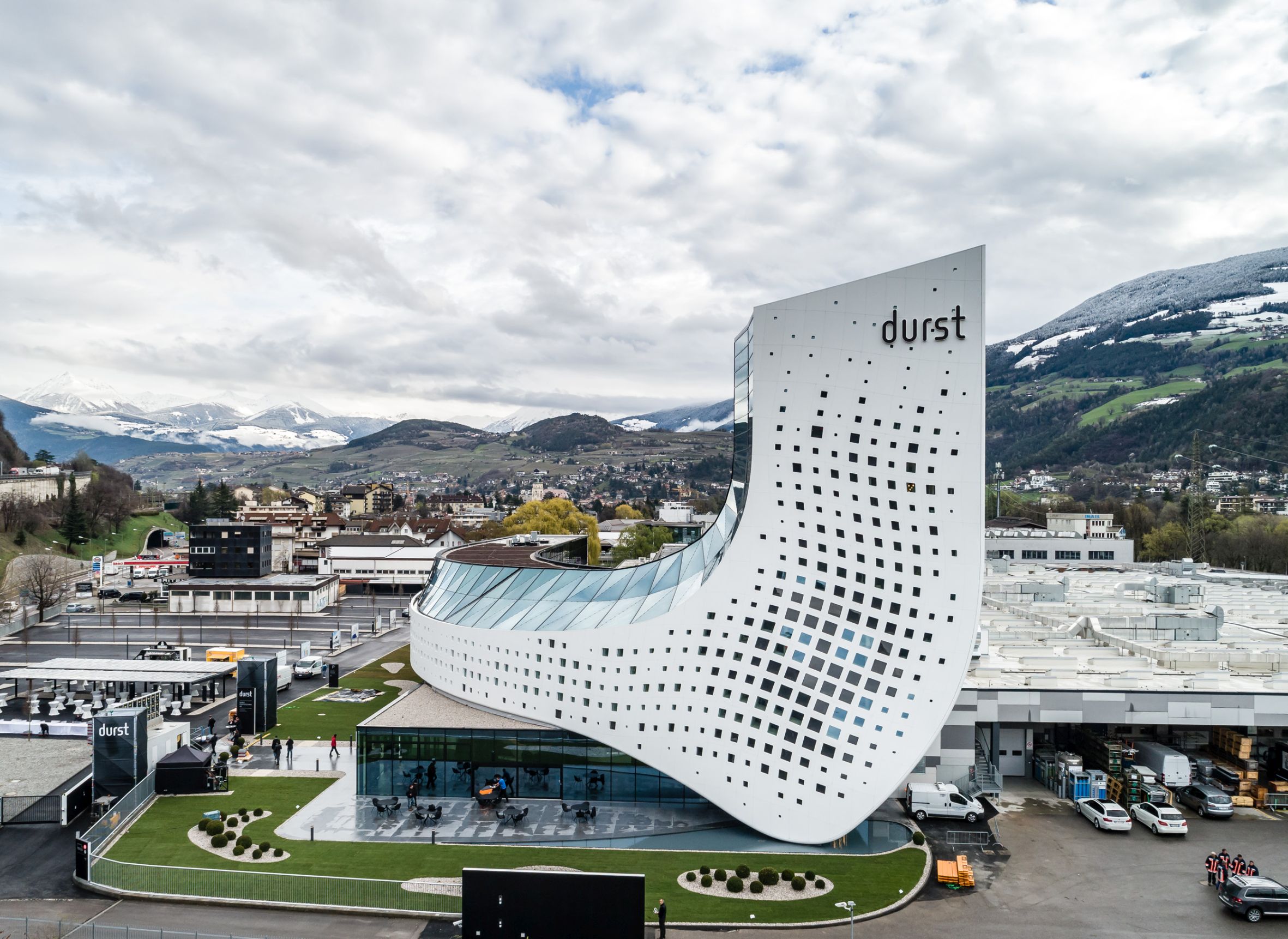 Con oltre 80 anni di storia legata al nome della famiglia Oberrauch a cui appartiene da tre generazioni, 700 dipendenti, di cui 280 ospitati nel quartier generale di Bressanone, 20 sedi nel mondo e 295 brevetti, Durst è oggi protagonista mondiale di sistemi di stampa digitale ad alte prestazioni per settori che abbracciano la comunicazione visiva, il mondo della ceramica, fino all’industria nei più variegati settori merceologici. Le soluzioni Durst spaziano dall’elaborazione delle immagini, alla stampa, fino alla finitura. Un processo integrato che viene trasferito anche all’architettura del nuovo edificioproiettato nel futuro, ma con un fil rouge che lo collega al passato. La nuova ala, progettata degli architetti Patrik Pedò e Juri Pobitzer dello studio bolzanino Monovolume, si integra a livello architettonico e funzionale con la sede storica e il sito produttivo, riprendendo un’idea mai realizzata dell’architetto Othmar Barth che progettò il primo stabilimento.