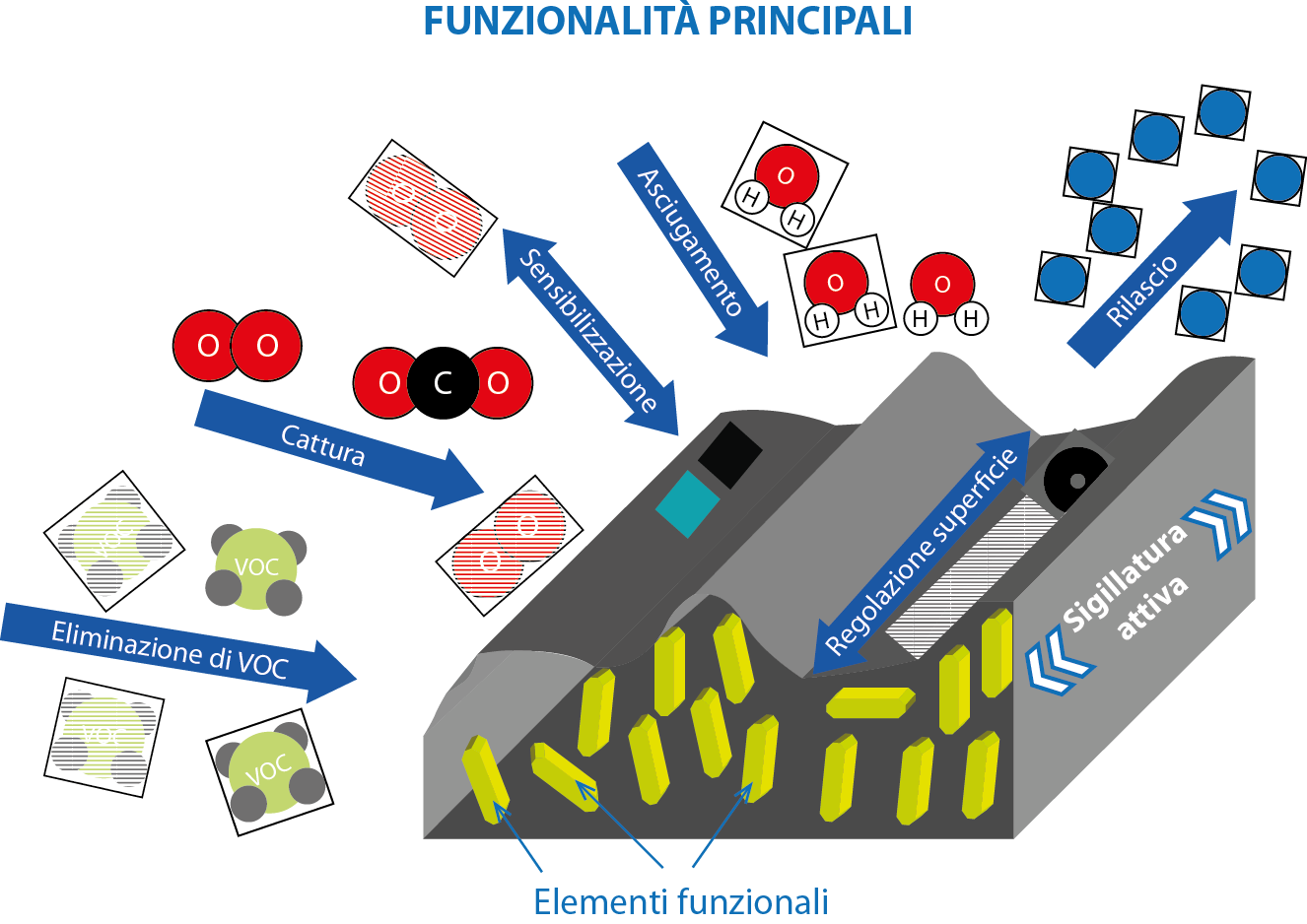 Gli inchiostri sono basati normalmente su alcuni componenti principali: leganti, agenti indurenti, additivi ed elementi funzionali; la loro adattabilità al processo di stampa dipende dalla natura e quantità degli additivi, dalla dimensione e distribuzione delle particelle, dalle proprietà della superficie di stampa e dal peso molecolare delle sostanze organiche. È quindi fondamentale tenere sotto controllo i composti polimerici funzionali in base alla tecnologia impiegata, alla chimica macromolecolare, alle dimensioni delle particelle e ai modificatori della superficie. Gli ossidi metallici sono impiegati normalmente nel controllo della reattività e delle dimensioni delle particelle. Come piattaforma regolabile vengono impiegati gli Zeoliti, minerali alluminosilicati microporosi usati abitualmente come assorbenti e catalitici; essi hanno struttura porosa aperta tridimensionale con pori microscopici definiti. La struttura zeolitica è costituita da elementi con geometria molecolare a forma di tetraedro, ossido di Silicio (SiO4) e ossido di Alluminio (AIO4) che condividono l’Ossigeno tra ogni due elementi consecutivi. Una soluzione ibrida si ottiene sciogliendo a livello molecolare un sale organico attivo in una matrice polimerica. Per ottenere i decontaminanti trasparenti si usa una matrice organica e l’indice di rifrazione per dispersione a livello molecolare è ottimale con particelle di dimensione inferiore a 100 nm. Le principali funzionalità degli inchiostri impiegati nel packaging attivo sono: la sensibilizzazione, la capacità di catturare sostanze attive, la facilità di rilascio, l’asciugamento, l’eliminazione di vapori di solventi (componenti organici volatili, VOC), l’ottimizzazione della superficie del supporto di stampa.