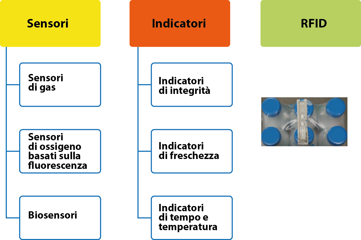 Con la dicitura “packaging attivo” si intende un imballaggio che ha funzioni attive per la protezione del prodotto imballato, specie in campo alimentare; il termine «smart» o intelligente indica invece un imballaggio in grado di rilevare o di misurare una caratteristica del prodotto contenuto, l’atmosfera all’interno della confezione o l’ambiente di trasporto. Gli imballaggi definiti attivi e intelligenti sono in grado di garantire meglio la tracciabilità dei cibi e di migliorarne la conservazione perché interagiscono direttamente con l’alimento senza modificarne la forma, il colore e il sapore. In primo luogo si tratta di atmosfere modificate che consentono di prolungare la scadenza degli alimenti, di materiali in grado di assorbire cattivi odori e di rilasciare sostanze per contrastare l’azione dei microrganismi. Alcune confezioni assorbono l’ossigeno oppure indicano il livello di maturazione della frutta. Gli imballaggi attivi interagiscono con l’alimento o con l’atmosfera all’interno della confezione assorbendo sostanze indesiderate o rilasciandone di utili. In altre parole eliminano i gas indesiderabili, o producono altri gas in modo da mantenere inalterato l’ambiente iniziale. Le atmosfere modificate si utilizzano in molti prodotti come la carne macinata, il pesce fresco, la frutta fresca sbucciata. Il trattamento viene indicato sulle etichette con la dicitura: «Confezionato in atmosfera protettiva». In genere viene aggiunta una miscela di tre gas, ossigeno, anidride carbonica e azoto in percentuale variabile a seconda dell’alimento e si crea all’interno della vaschetta un ambiente che rallenta l’azione di batteri e microrganismi. Nel caso delle verdure, la miscela inibisce la respirazione delle foglie e rallenta l’azione degli ormoni vegetali molto attivi nella fase di maturazione, aumentando l’intervallo di durata. Nelle vaschette di carne l’ossigeno consente di mantenere vivace il colore naturale, mentre nei contenitori di salumi affettati si inibisce l’irrancidimento.