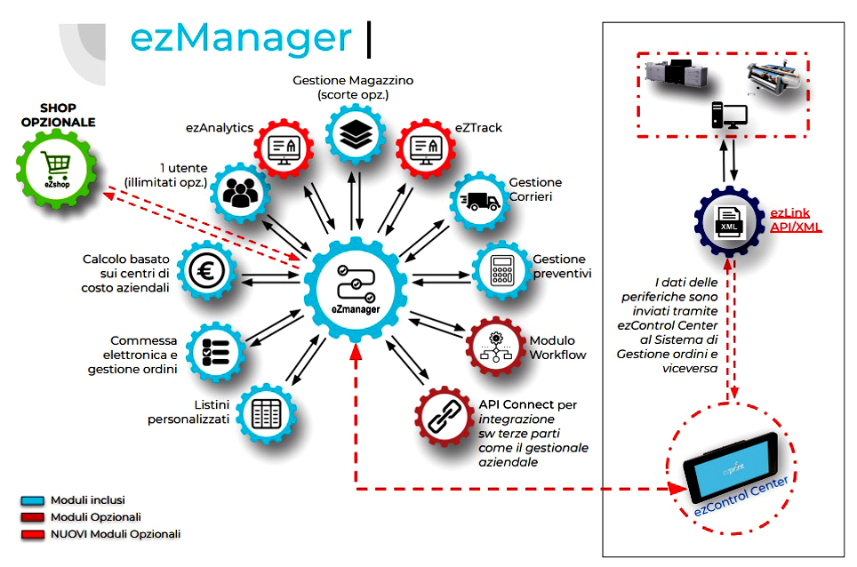 ezPRINT è un sistema aperto ed estremamente flessibile, in grado di interagire efficacemente sia con utenti e clienti che con i sistemi di stampa e finitura, per arrivare alla gestione del rapporto con i partner per la consegna e distribuzione dei prodotti. La tecnologia basata su API e XML che lo contraddistingue, permette di scambiare informazioni con i sistemi di produzione, facendo da perno per la soddisfazione dei criteri legati al piano Industria 4.0, consentendo quindi di accedere ai numerosi vantaggi di tale iniziativa. ezPRINT è composto da: Manager per la gestione dei costi e la pianificazione della produzione; Shop per la creazione di un negozio virtuale dove mostrare i prodotti; Editor un sistema di editing online HTML5 per la realizzazione di prodotti a partire da template predefiniti; Flow un flusso di automazione JDF/XML per la integrazione con i servizi di controllo e ottimizzazione dei file, correzione colore specifica per i sistemi di stampa, imposizione e controllo della finitura.