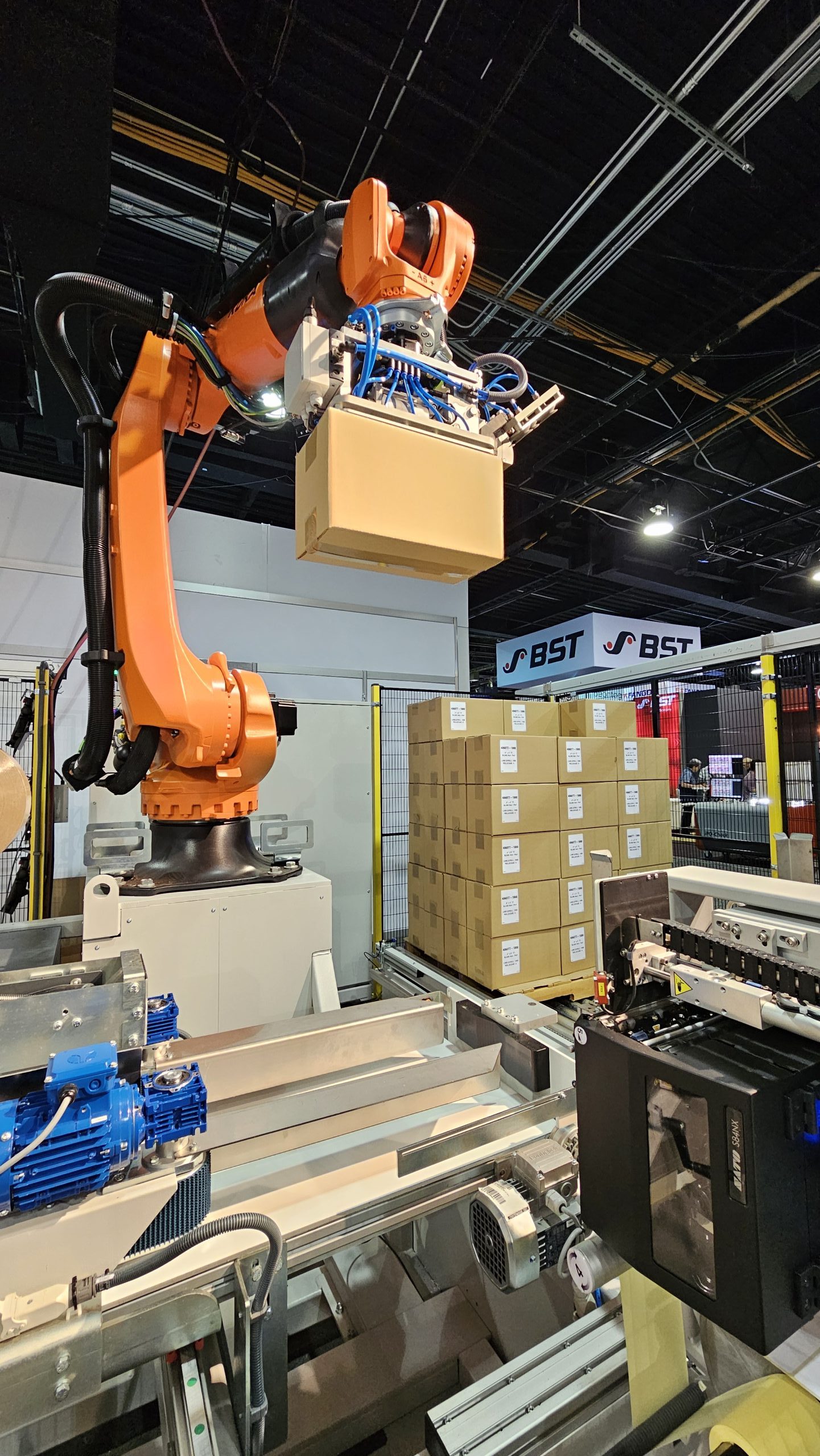 Nello stand Lemu il materiale veniva riavvolto dal ribobinatore automatico GTU in larghezza 660mm con taglio longitudinale, inserimento automatico delle anime in cartone, giunzione iniziale delle bobine e chiusura finale con etichetta stampata digitalmente in tempo reale, estrazione automatica delle bobine e convogliamento nella linea robotica Lemu UltraCompact. In quest’ultima, le bobine venivano inserite roboticamente nelle scatole in cartone; le scatole venivano infine etichettate e posizionate automaticamente sui pallet per la successiva spedizione logistica.