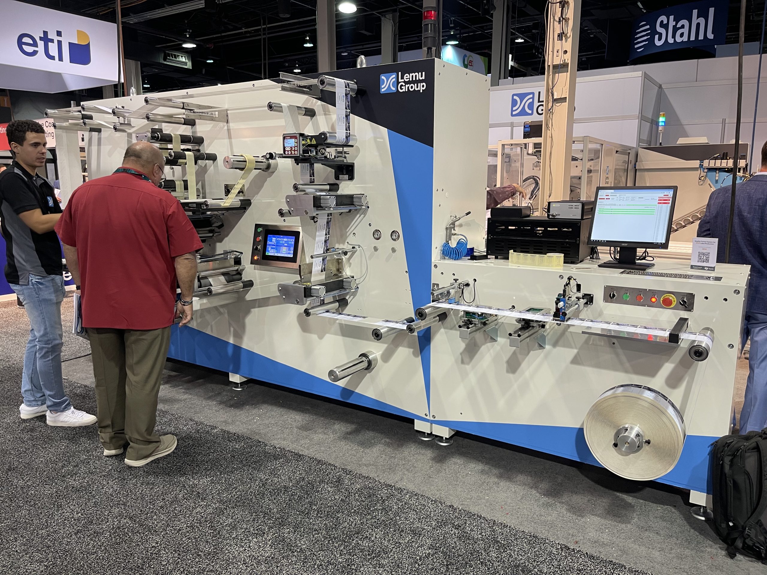 La linea consisteva in due sbobinatori automatici Martin Automatic, per lo svolgimento del liner e del materiale pre-siliconato. Da qui il materiale passava direttamente all’impianto Cohesio di ETI Converting, con moduli di stampa, adesivizzazione, siliconatura e fustellatura, collegati al compattatore di matrici Lundberg per gestire e rimuovere la matrice di scarto. Infine, il materiale attraversava un ponte fino allo stand di LemuGroup, consentendo ai visitatori di osservare il processo camminando al di sotto del materiale.