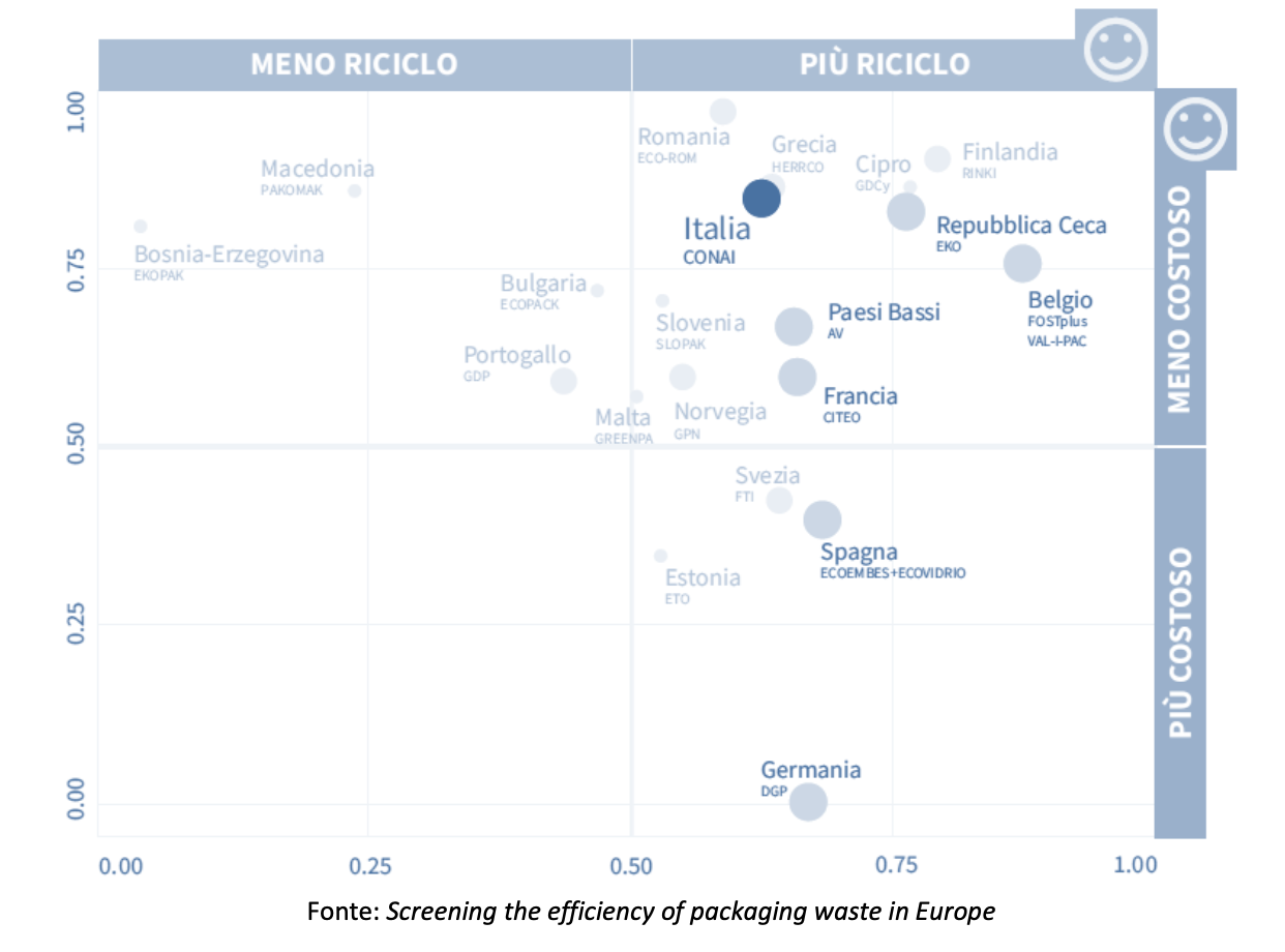 I Paesi hanno costruito diversi modelli di gestione dei rifiuti di imballaggio, ognuno con specificità proprie. Quello Italiano, rappresentato da CONAI, è uno dei più efficienti e meno costosi.