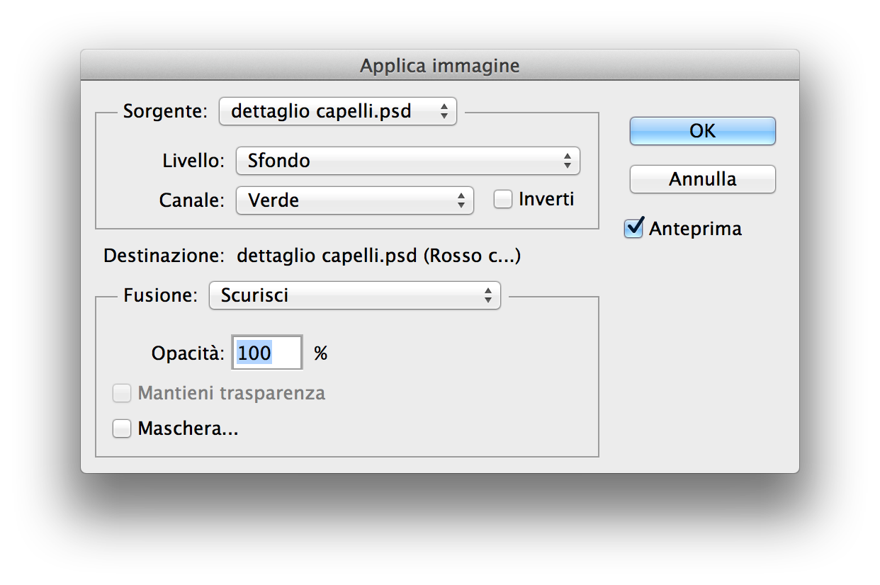 In questa occasione, anche se non strettamente indispensabile, faremo ricorso al comando Applica Immagine per sommare le componenti più scure di ogni canale e recuperare così una maschera ottimale.