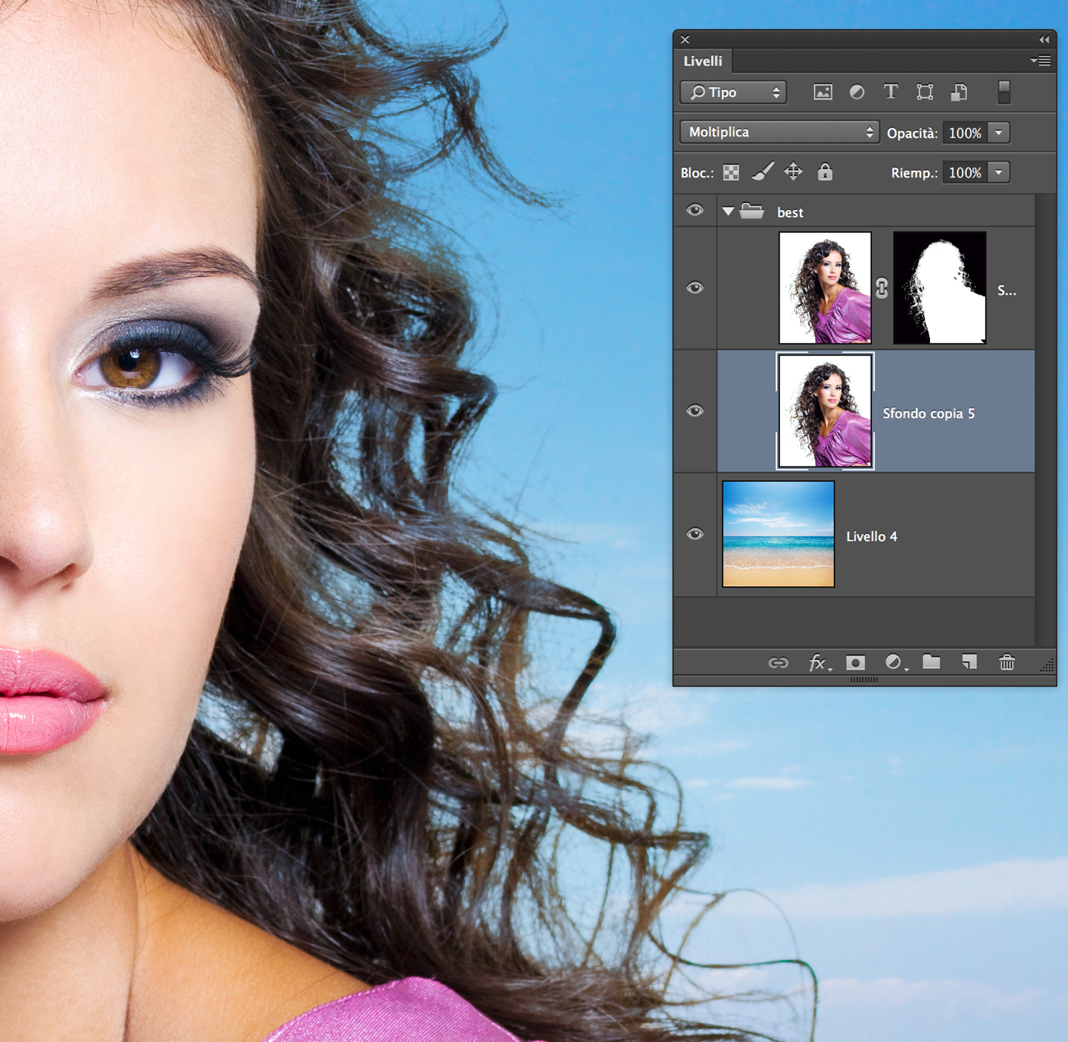 Il livello duplicato che al momento dovrebbe trovarsi tra quello mascherato e lo sfondo deve essere messo in Moltiplica, e a questo punto avete recuperato anche quei capelli più trasparenti che neppure la nostra maschera era riuscita a rispettare.