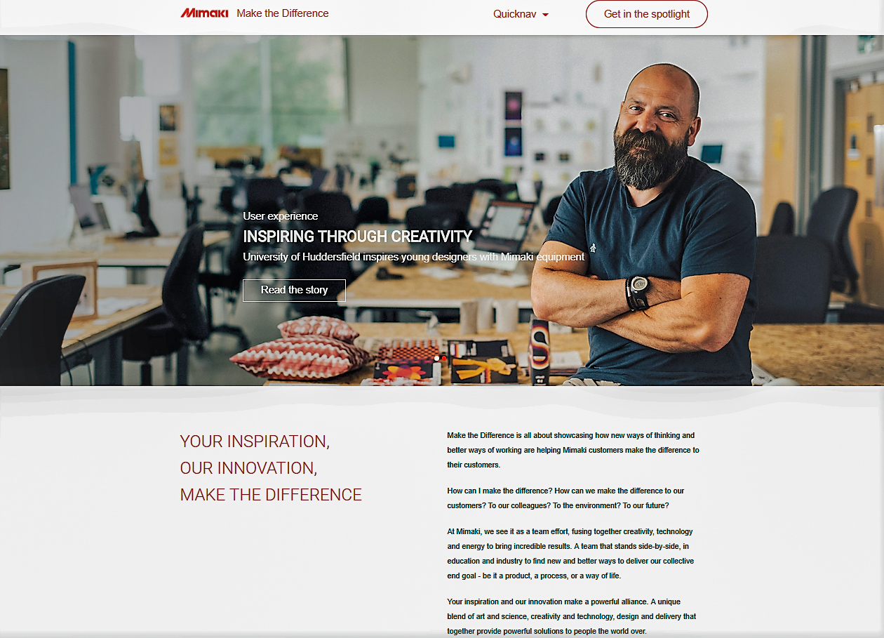 Le prime testimonianze sono già on air sulla pagina dedicata alla campagna Make the Difference che racconta storie che vedono come protagonisti clienti di tutta Europa. Tra essi l’inglese Gate7, specializzato nella stampa di componenti per il mercato edilizio, agricolo e industriale, e il suo cliente KUHN, produttore di macchinari agricoli, nonché la premiata università di Huddersfield, nel West Yorkshire, sempre nel Regno Unito. Nella sezione del sito riservata al progetto, oltre al blog tecnico dove vengono descritte le core technologies Mimaki in grado di garantire produttività, affidabilità ed eccellenza a tutti i livelli, è anche possibile compilare il modulo per candidarsi e diventarne protagonisti.