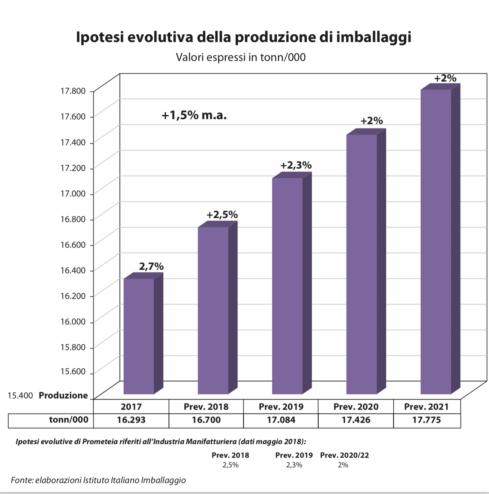 Analizzando la correlazione che esiste tra l’andamento dell’industria manifatturiera e il settore del packagingè stata presentata l’ipotesi evolutiva della produzione di imballaggi. A partire quindi dalle ipotesi di crescita del comparto manifatturiero è stato ipotizzato per il settore dell’imballaggio un tasso di crescita medio annuo del 2,5%che potrebbe portare nel 2021 a produrre 17.775 migliaia di tonnellate di imballaggi per un corrispettivo in termini di fatturato pari a 35 miliardi. Prospettive buone anche se l’Italia sta impiegando tanto tempo a recuperare le quote produttive pre-crisi ma, a detta di Iascone, siamo sulla buona strada per riprendere a crescere con tassi costanti.