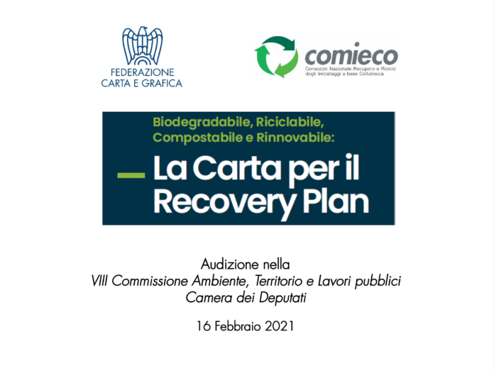 Federazione Carta e Grafica e Comieco hanno sviluppato una posizione comune sul Recovery Plan nella certezza di poter supportare lo sforzo richiesto all’Italia sulle questioni cruciali evidenziate in audizione: l’applicazione del digitale alla gestione e alla tracciabilità dei materiali destinati ad assumere nuova vita come Materia Prima Seconda; lo sviluppo di una impiantistica che sia finalmente adeguata a diminuire drasticamente il tasso ancora troppo elevato di conferimento in discarica; un quadro normativo che dia certezza e prospettiva agli investimenti della filiera nella valorizzazione, anche energetica, dei rifiuti e degli scarti derivanti dai processi di recupero e riciclo; il passaggio della logistica dalla gomma al ferro.