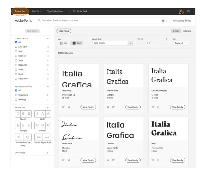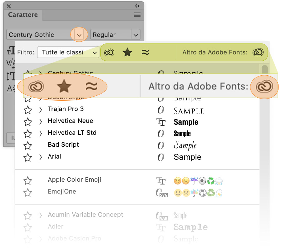 Le icone a fianco del menu del filtro famiglie permettono di filtrare i font provenienti dall’universo Adobe Font, quelli che abbiamo contrassegnato come Preferiti e quelli simili al font correntemente in uso, mentre all’estrema destra troviamo il pulsante per l’accesso alla versione web.
