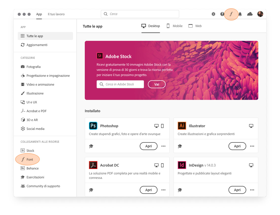Già dal classico pannello Carattere (in figura quello di Photoshop, per Illustrator e Indesign la struttura è analoga) abbiamo accesso alle utility di Adobe Font: il filtro dei font Adobe attualmente attivati, gli eventuali preferiti indicati dall’utente, i font simili a quello selezionato e il pulsante di accesso alla versione webAnche dall’app Adobe Creative Cloud si può accedere alla versione web di Adobe Font, questa app è stata di recente rinnovata e potenziata, assumendo dimensioni e caratteristiche molto simili a quelle di un portale grafico-creativo multiservizio