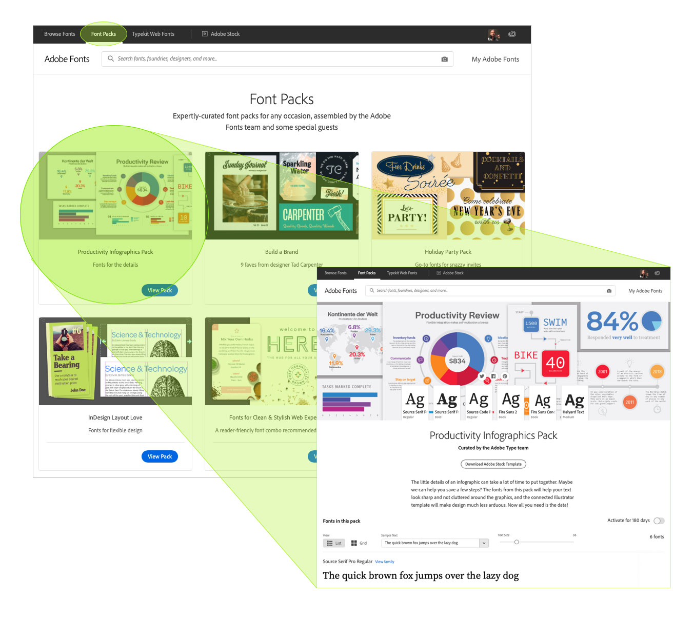 I Font pack sono una delle introduzioni dell’ultimo anno, si tratta di pacchetti tematizzati di font che si abbinano bene tra loro, sia per stile che leggibilità, preparati dal team di designer Adobe.
