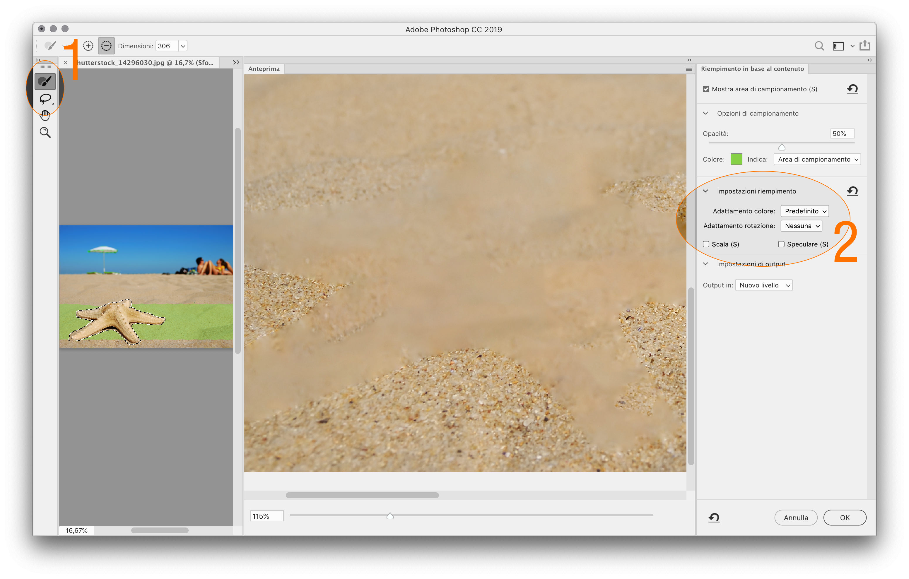 All’apertura della sotto-area di lavoro troviamo a sinistra i due strumenti chiave (zona 1 dell’immagine 2): il Pennello Campionamento che serve per indicare le aree da cui dovranno essere calcolati i dati utili per il riempimento (ma soprattutto per escludere le aree non utili in tal senso), e il Lazo, con funzionamento analogo a quello tradizionale che in questa sede serve a rifinire ulteriormente i contorni sulla base del risultato in anteprima.