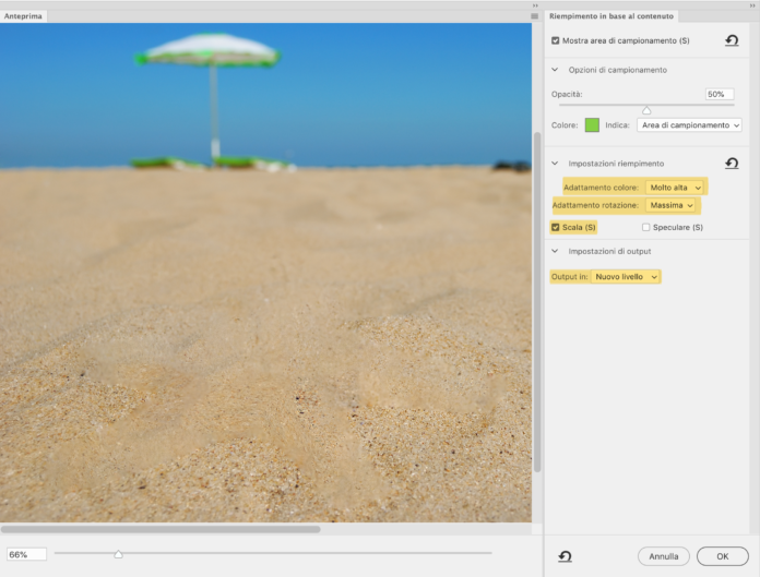 Nelle due aree di anteprima troviamo a sinistra l’immagine originale, con l’area selezionata prima dell’attivazione del comando, e la sovrimpressione in verde semitrasparente per indicare le aree che Photoshop userà per riempire le zone selezionate.