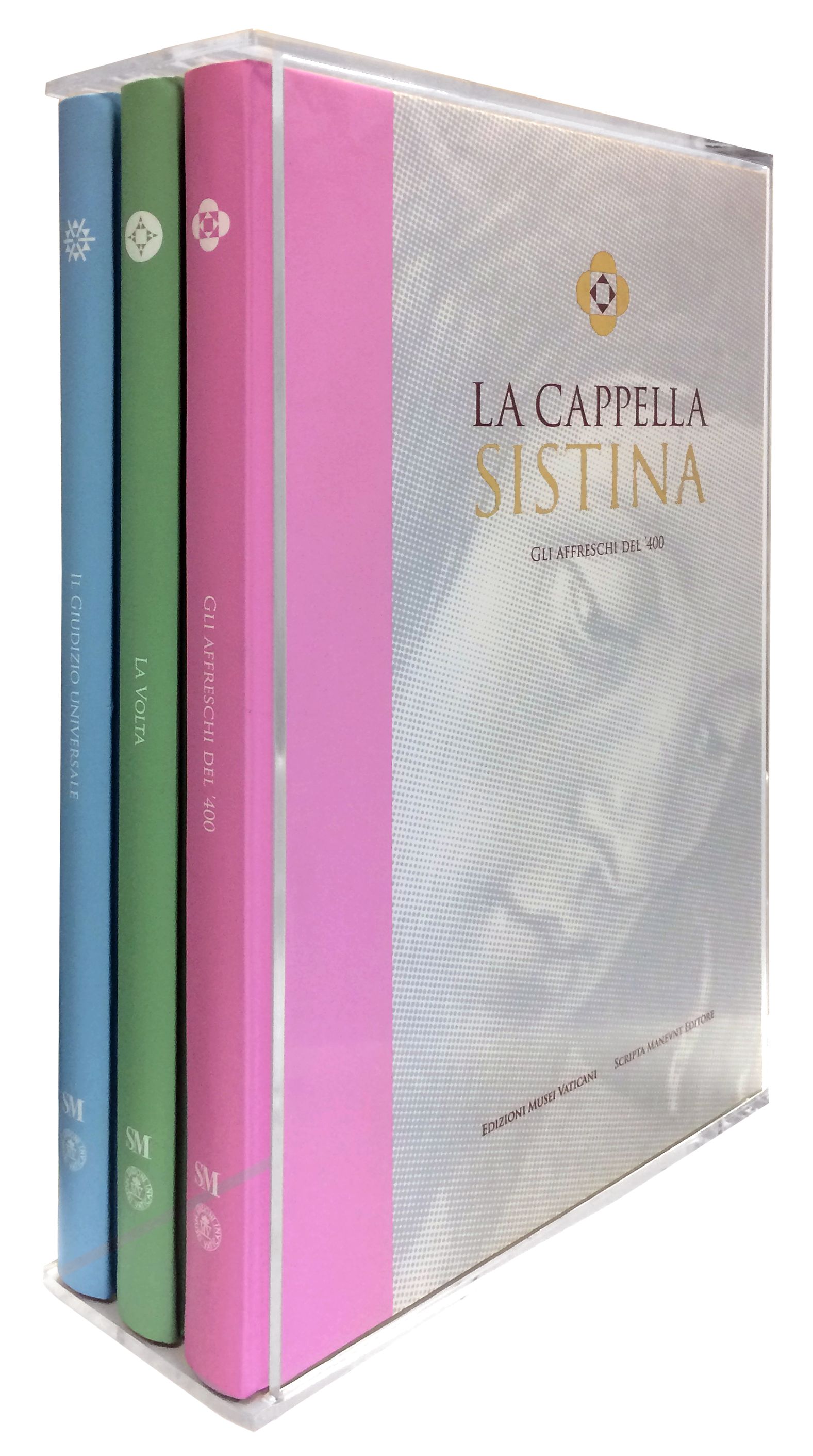 I capolavori sistini sono mostrati in tre volumi: Gli affreschi del ‘400 di 268 pagine che comprende 12 sestini, Il Giudizio Universale di 252 pagine che comprende 10 sestini, La Volta di 258 pagine che comprende 11 sestini.