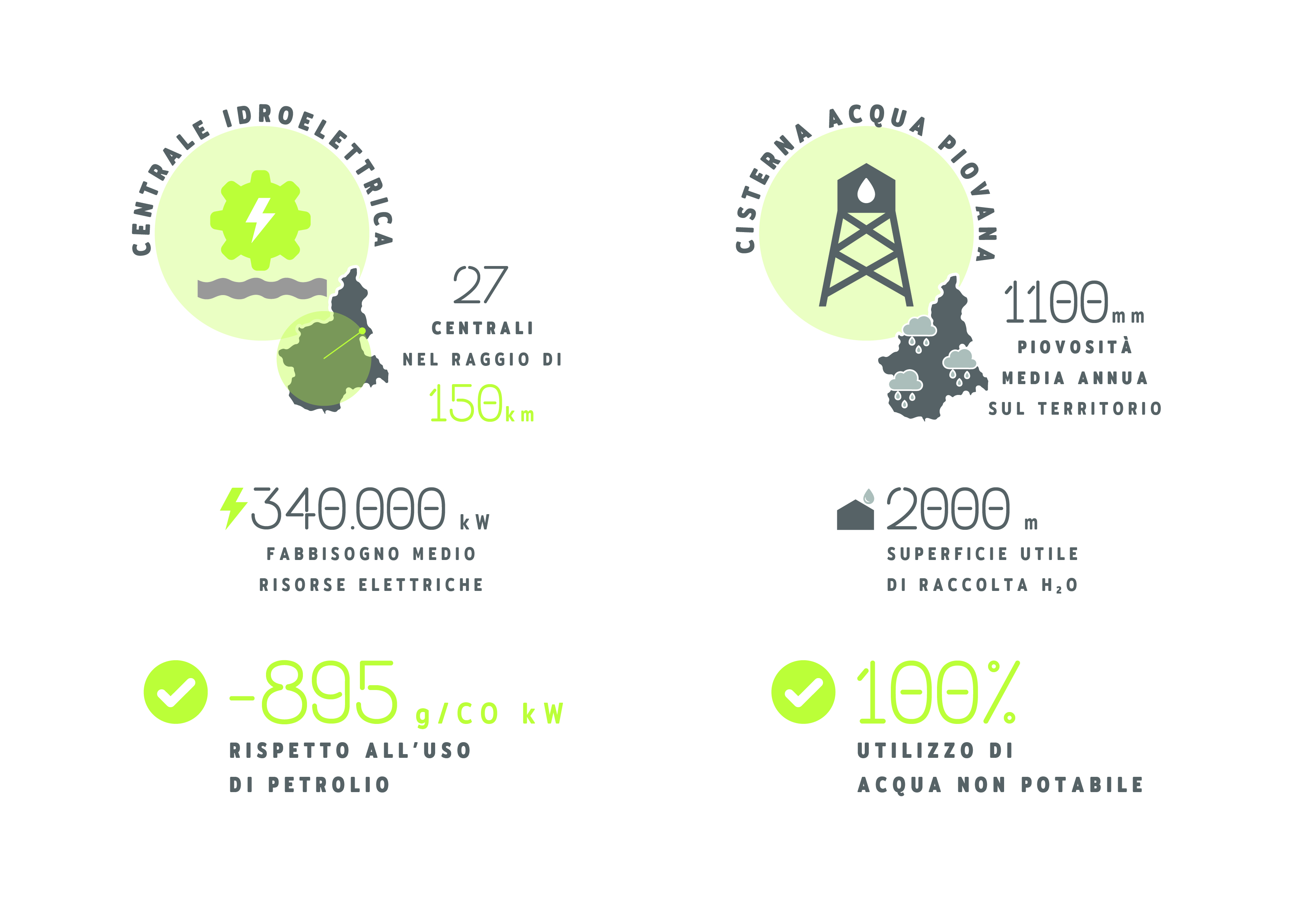 Nel caso dell’energia elettrica, la scelta ricade per esempio, su fonti idroelettriche o eoliche, che consentono un notevole abbassamento nelle emissioni di gas serra nell’atmosfera rispetto all’energia elettrica da rete. Riguardo le risorse idriche, quelle utilizzabili per le operazioni di produzione e lavaggio non richiedono potabilità, pertanto si ipotizza l’uso di sistemi di raccolta dell’acqua piovana, che possono arrivare a soddisfare il fabbisogno di un’intera attività nel caso di stabilimenti di medie dimensioni.