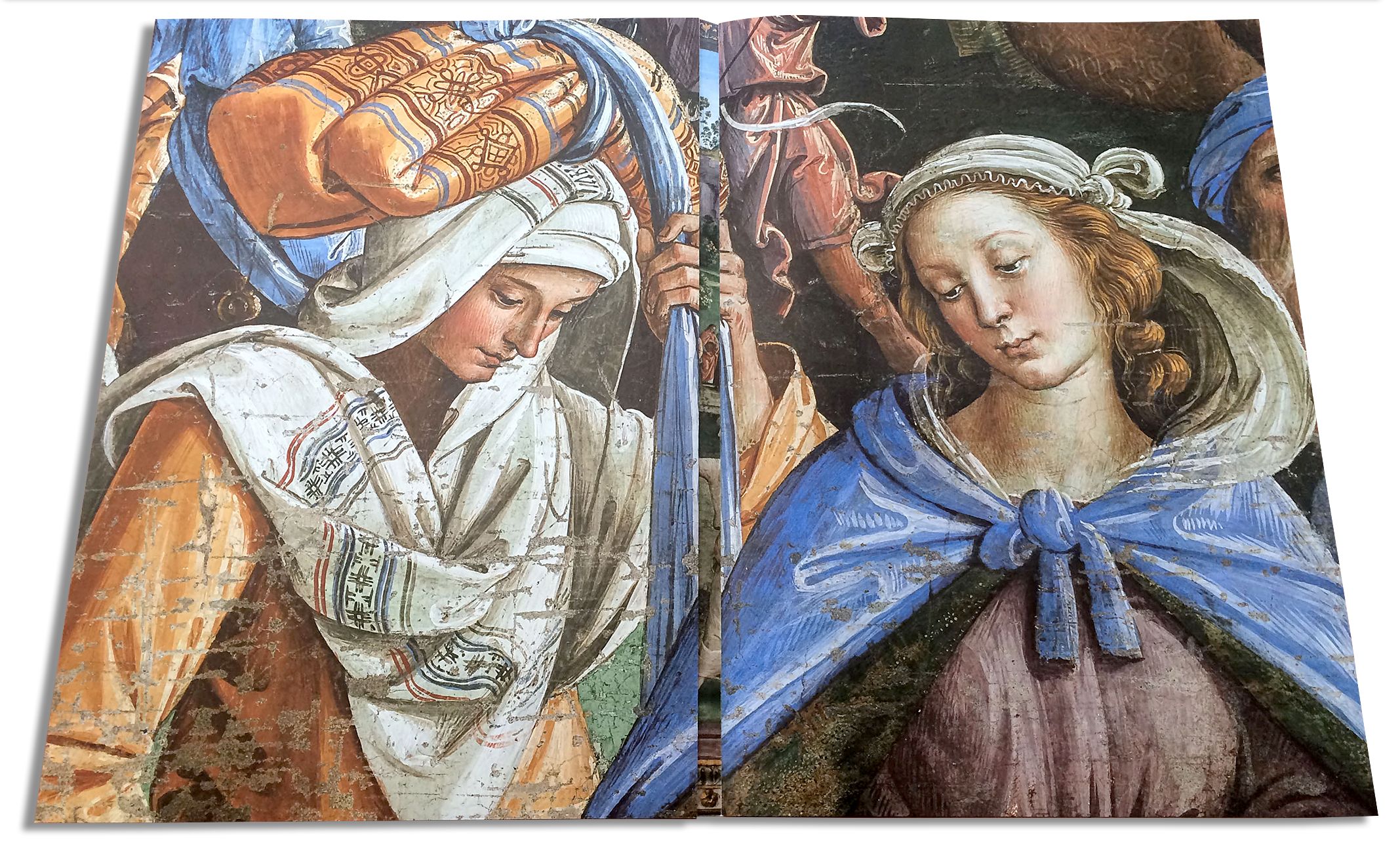 L’inquadratura e il «taglio» dell’immagine è stata decisa osservando l’impaginazione del lavoro, permettendo di effettuare gli spostamenti in modo rapido, senza dover mettere mano ogni volta al «pesante» file .tiff aperto con PH. Uno specifico profilo colore è stato utilizzato per generare la separazione (conversione) del colore da metodo RGB a Multicolore allo scopo di ottenerne sei colori; quattro colori di quadricromia più due colori Spot/Pantone, scelti in base all’analisi dei colori preponderanti su ogni singolo soggetto dell’affresco.