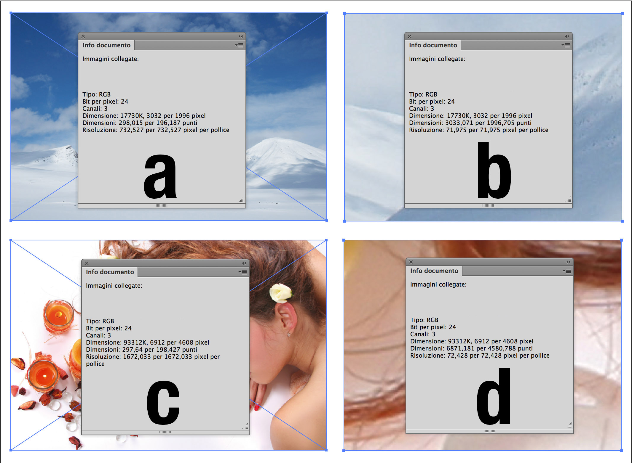 Le immagini impaginate in un documento di illustrator con le relative informazioni: misurano circa 6 Megapixel e con quell’ingombro hanno una risoluzione intorno ai 730 ppi, nell’ingrandimento 10x a destra la risoluzione risultante è di circa 72 ppi. L’immagine B è oltre i 30 Megapixel, anche se l’ingombro fisico è identico al precedente la risoluzione risultante è di 1670 ppi, nell’ingrandimento a destra la risoluzione risultante è 72 ppi circa ma il fattore di ingrandimento è ovviamente molto maggiore dell’altra immagine.