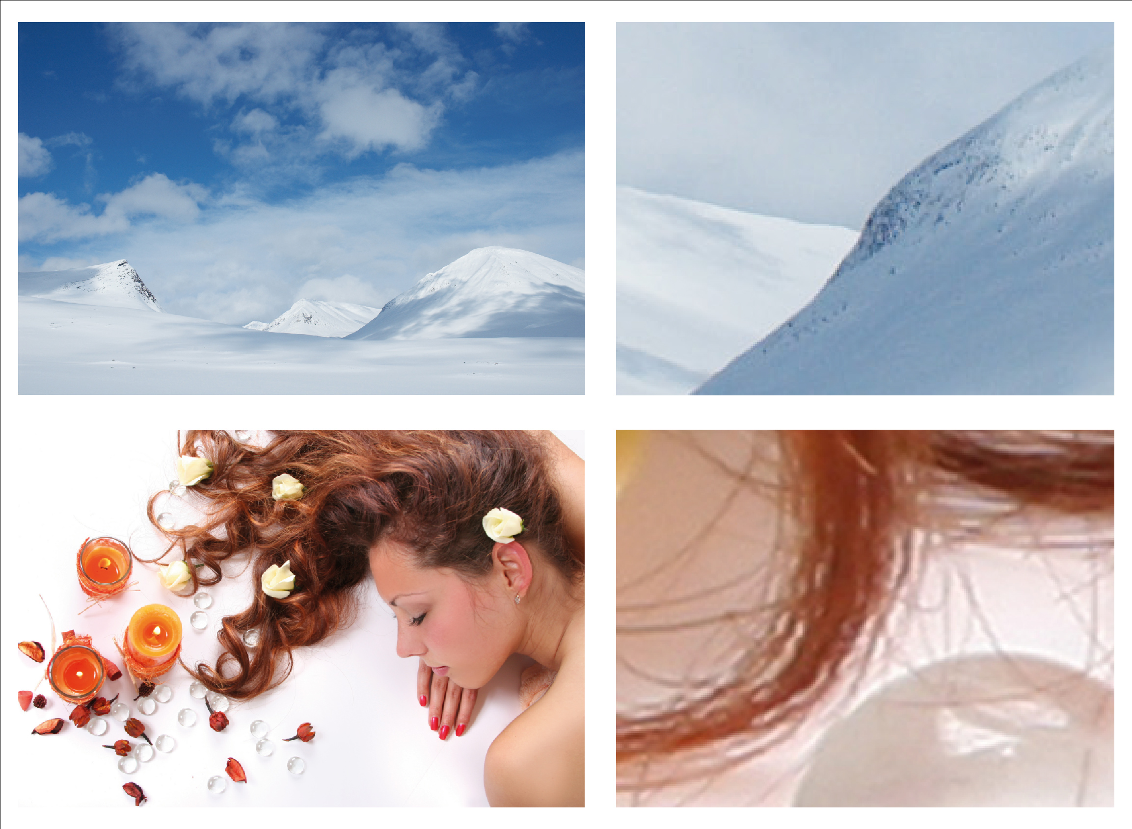 L’immagine in alto è sostanzialmente a basse frequenze, quella in basso invece ha diverse parti ricche di alte frequenze. Entrambe sono state portate a 72 ppi nei riquadri sulla destra, ma mentre quella in alto non evidenza grossi artefatti di ingrandimento quella in basso tende a “sgranare” con facilità. Per questo è opportuno mantenere risoluzioni di output più elevate (a parità di dimensioni fisiche) per le immagini con dettagli sottili.