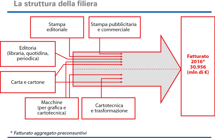 La filiera è un mondo da quasi 31 miliardi di euro di fatturato, spiega Nova, però è una realtà composita, formata da imprese di settori diversi con proprie dinamiche e che, a differenza di altri settori manifatturieri italiani, ha dovuto attendere più a lungo la fine della crisi, con risultati al momento meno positivi. «Mentre per altri settori dal 2012 si è assistito a una ripresa dei fatturati – tanto che per molti il 2016 è stato l’anno di recupero dei livelli pre crisi – per la filiera carta e stampa le difficoltà sono proseguite fino al 2014 e si è dovuto attendere il 2015 e 2016 per raggiungere quel punto di assestamento da cui ora si potrà ricominciare a crescere».