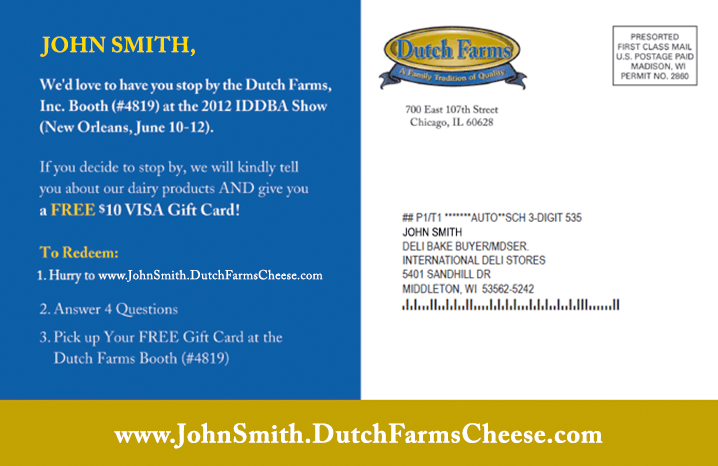 Dutch Farm Cheeseèun produttore di formaggi olandesi che aveva come intento quello di portare i propri utenti a visitare il proprio stand in una importante fiera di categoria. Attraverso una campagna su vari formati (wide format, cartoline, flyer e altro) ha invogliato le persone a visitare lo stand tracciandoli attraverso la generazione di Purl (Personalized URL), indirizzi Web personalizzati in grado di tracciare la provenienza di ogni singolo visitatore. Attraverso la creazione di materiale cartaceo d contenenti URL tracciabili, gli utenti erano invogliati a riscuotere il buono sconto di $10. Il codice riportava a una landing page nella quale le persone lasciavano i loro dati e l’effetto scaturito èstato quello di ricevere nominativi e – nel contempo – tracciare esattamente da quale fonte essi provenivano.