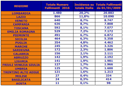 La Lombardia, con una incidenza sul totale Italia del 20,2%, si conferma la regione d’Italia con il maggior numero di fallimenti con 1.480 casi nel corso del 2016. Dal 2009 a oggi si contano 20.883 imprese lombarde fallite.