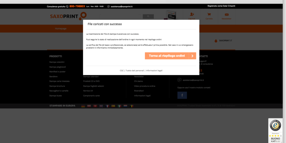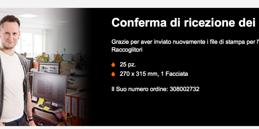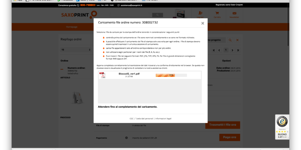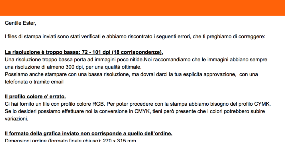 Per verificare il funzionamento del preflight abbiamo volutamente inviato un file con errori (immagini RGB, basse risoluzioni, dimensioni sbagliate). Il sistema ha intercettato tutti i problemi e ha inviato un’email di avviso con spiegazioni chiare e utili a correggere gli errori. Il caricamento successivo del file PDF corretto ha poi dato il via alla lavorazione.