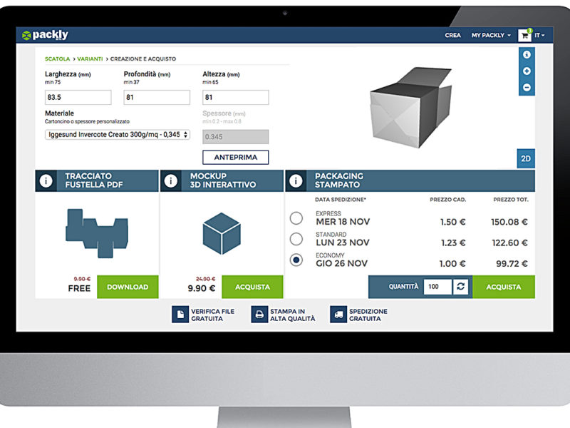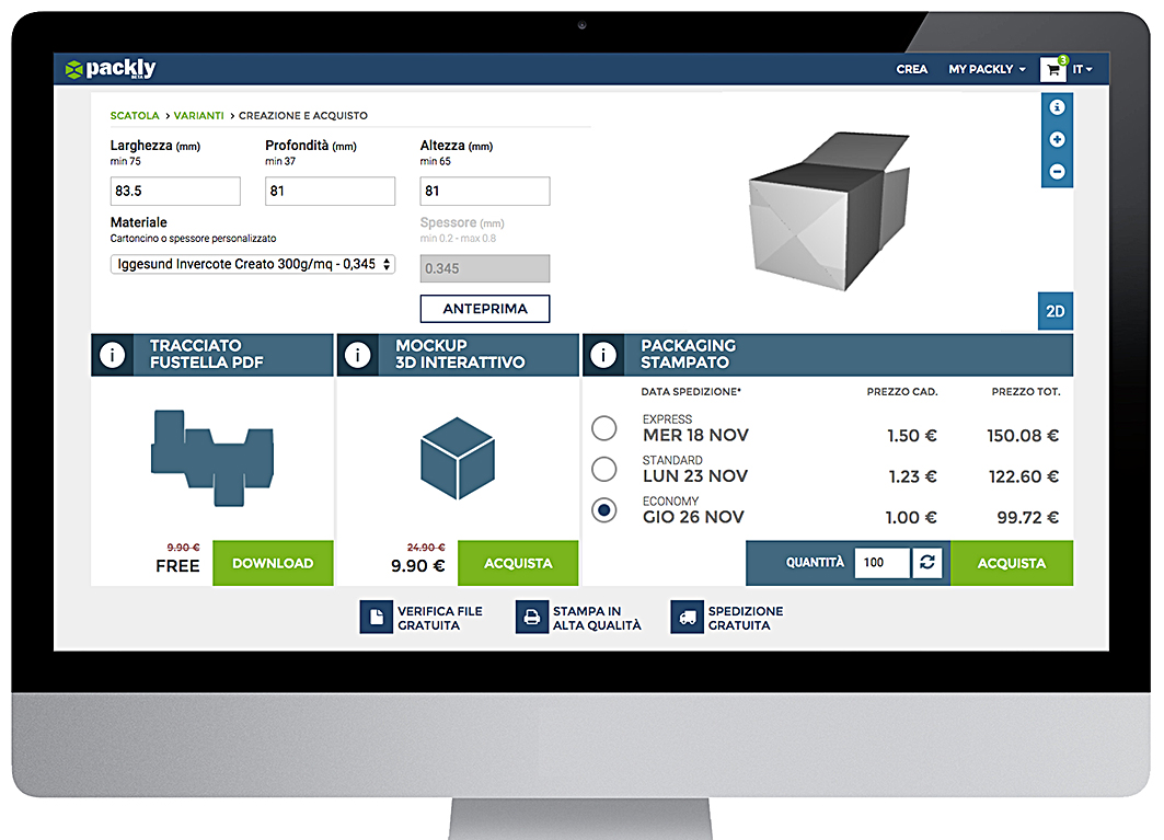 Un servizio Web to pack Packly è una Web start-up italiana fondata da Giuseppe Prioriello, allo scopo di soddisfare le necessità di designer, agenzie creative, aziende grafiche, che desiderano creare e scaricare tracciati fustella professionali su misura e stampare packaging in modo facile e veloce. Una delle particolarità di Packly, che è online in versione beta da qualche mese, è di avvalersi per la produzione cartotecnica di tecnologie interamente digitali. Gli utenti Packly possono stampare esattamente il numero di copie di cui hanno bisogno, infatti, è possibile acquistare anche una sola scatola, quindi senza minimi d’ordine. In base alla tipologia di ordine che ricevono e alla quantità di pezzi da produrre, gli esperti Packly scelgono le tecnologie più adatte, tra queste un sistema di fustellatura completamente digitale che effettua la cordonatura senza una fustella meccanica, e taglio laser, in unico passaggio (cordonatura etaglio). Tramite il sito Web, si può «scaricare» la fustella generata in tempo reale sulla base delle dimensioni inserite ma si può anche caricare la propria grafica, (figure 1 e 2) per ricevere un prodotto di packaging stampato che sarà consegnato in 48 ore. Si ha anche la possibilità di ordinare dei mockup virtuali in 3D allo scopo di vedere e valutare il risultato previsto su un file PDF interattivo, prima di toccarlo con mano. Nato per risolvere due problemi nel mondo del packaging, uno relativo alla creazione di tracciati fustella, un processo non semplice che richiede esperienza; l’altro è l’esigenza di avere in mano un packaging in piccole tirature che è più costoso e richiede più tempo se realizzato con le tecniche analogiche. L’idea di Packly si consolida in base alle richieste del mercato. Infatti, un numero crescente di aziende richiede scatole con dimensioni personalizzate in piccole quantità. Spesso si tratta di piccole aziende, con volumi produttivi contenuti, oppure di imprese più grandi che hanno la necessità di testare il packaging di un nuovo prodotto, di acquistare tirature più limitate per scopi promozionali. Con il mockup 3D virtuale interattivo di Packly è possibile avere un’anteprima in tre dimensioni del packaging, ruotarlo a 360° per visionarlo da ogni angolazione. Il mockup 3D virtuale è uno strumento utile per condividere l’idea di un progetto con colleghi e clienti prima di avviare una produzione definitiva. Tracciati fustella personalizzati. In pochi passaggi gli utenti possono creare un tracciato fustella e scaricarlo in tempo reale: una soluzione pratica e veloce per realizzare fustelle anche senza avere conoscenze avanzate di progettazione strutturale. I tracciati fustella sono professionali, scaricabili in formato PDF, pronti per essere importati o aperti utilizzando un software di grafica vettoriale.