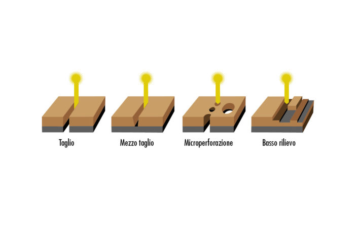L’illustrazione indica le differenze tra le varie lavorazioni che si possono ottenere con il laser, la meno nota è l’ablazione: l’effetto ottenuto è visibile sul cartoncino. Asportando differenti spessori di materiale si visualizza un’immagine sia in incavo (nel nostro caso) come in rilievo.