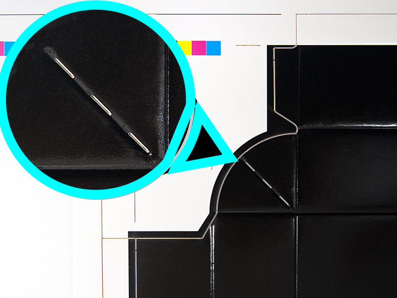 Nel cerchio colorato l’ingrandimento del particolare dello stampato allo scopo di evidenziare la precisione tra la fustella realizzata in digitale e il taglio laser. Precisione da non sottovalutare se per esempio si deve realizzare una sola copia, non ci possono essere scarti di avviamento delle tecnologie coinvolte nel processo.