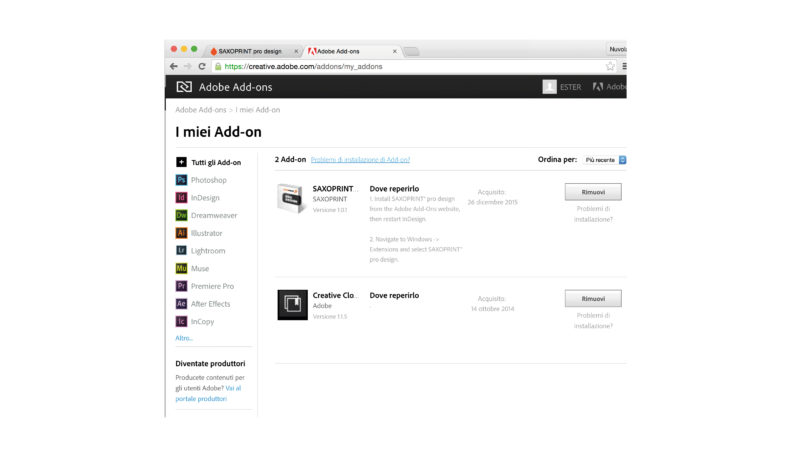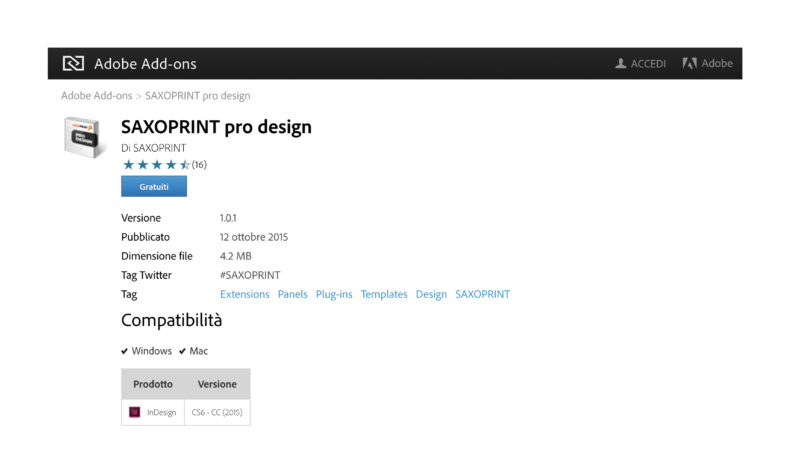 Dal sito di Saxoprint si sceglie di installare l’add-on Saxoprint pro design; automaticamente si viene rediretti sul sito di Adobe nella sezione dedicata agli add-on, alla pagina di presentazione dell’add-on (https://creative.adobe.com/addons/products/12338#.VolJe5PhDdc).
