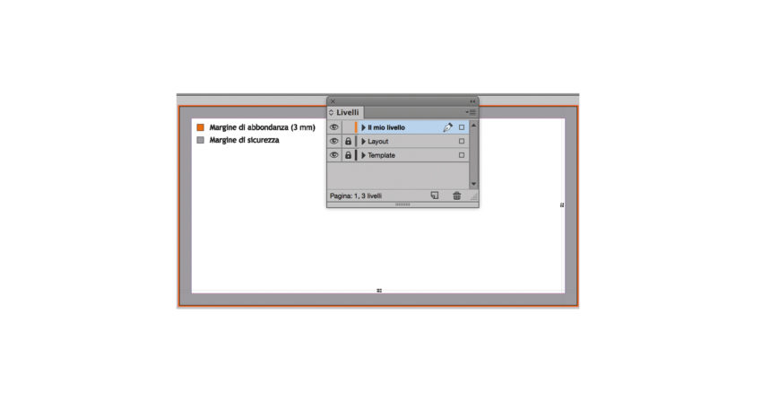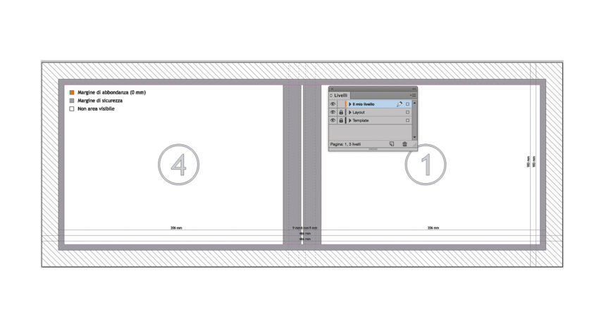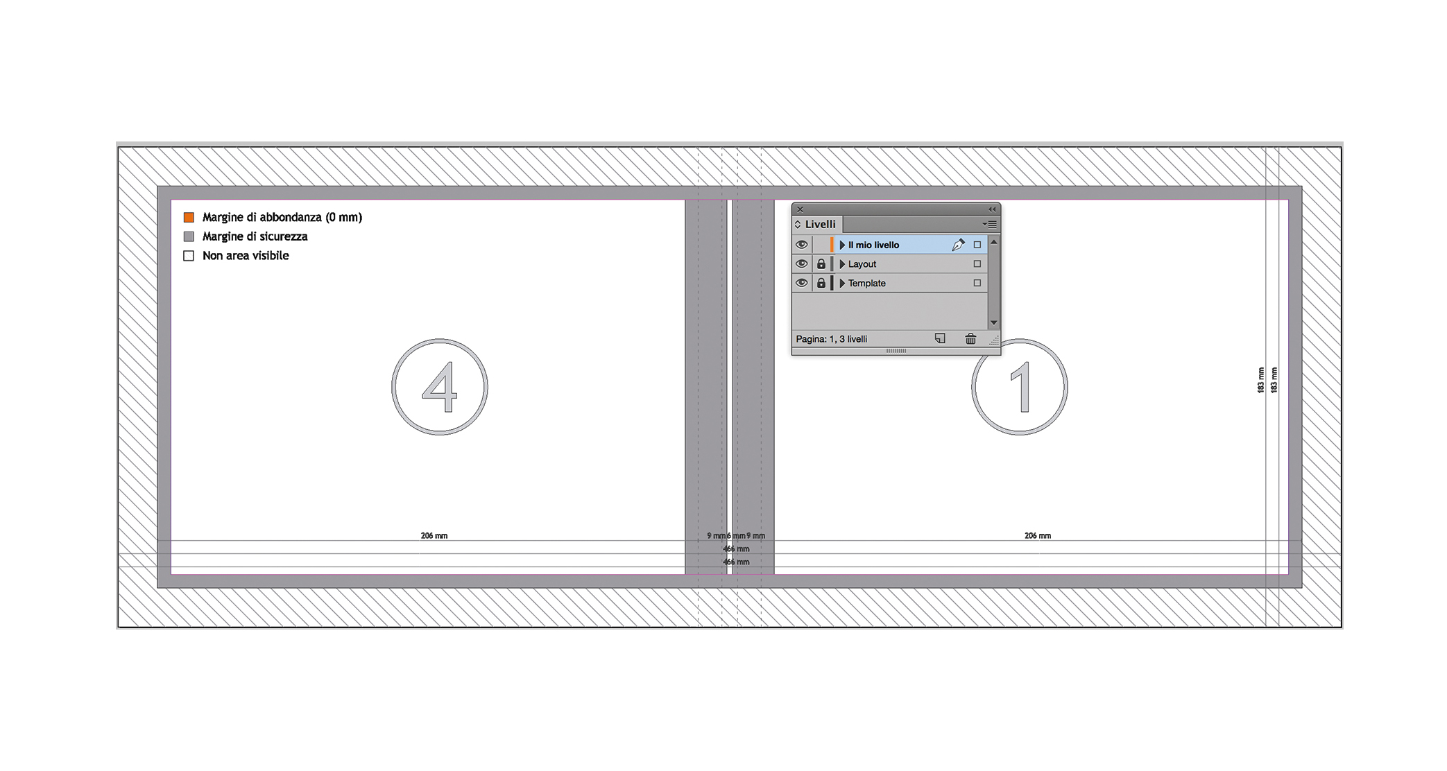 Il documento creato a partire dal template scelto viene proposto nel formato finale con l’aggiunta dell’area per l’abbondanza. All’interno di InDesign tutte le palette di stile sono vuote, mentre nella palette dei campioni sono presenti i colori CMYK utilizzati per evidenziare le informazioni di struttura. Come scritto nella guida tecnica Saxoprint, prima di finalizzare il file e preparare quindi il file PDF, è necessario cancellare i livelli di costruzione, quelli che servono soltanto a facilitare la creazione del documento (Layout e Template), per evitare che questi vengano stampati.