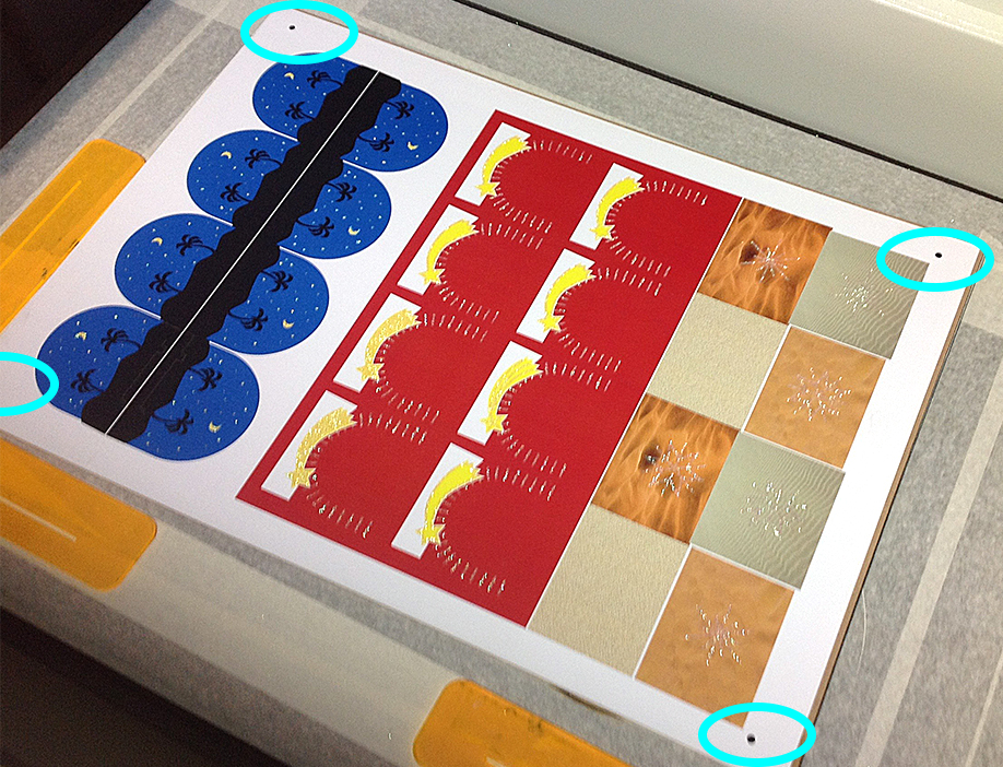 Il substrato è posto in modo non preciso sul piano della macchina. I «pallini» hanno lo scopo di far in modo che la telecamera rilevi la loro posizione e il laser si adatti di conseguenza.
