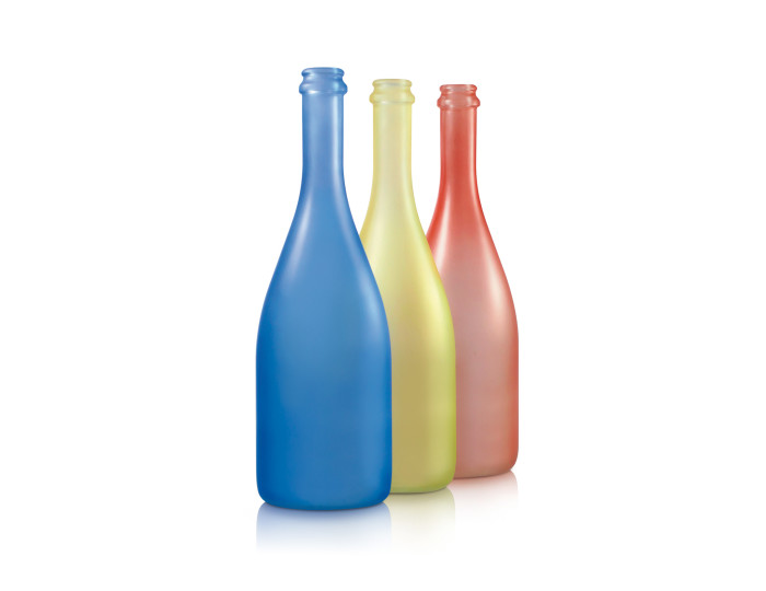 Bottiglie colorate con la tecnica del cambio molecolare del vetro con effetto satinato traslucido. Realizzazione P&P Promotion.