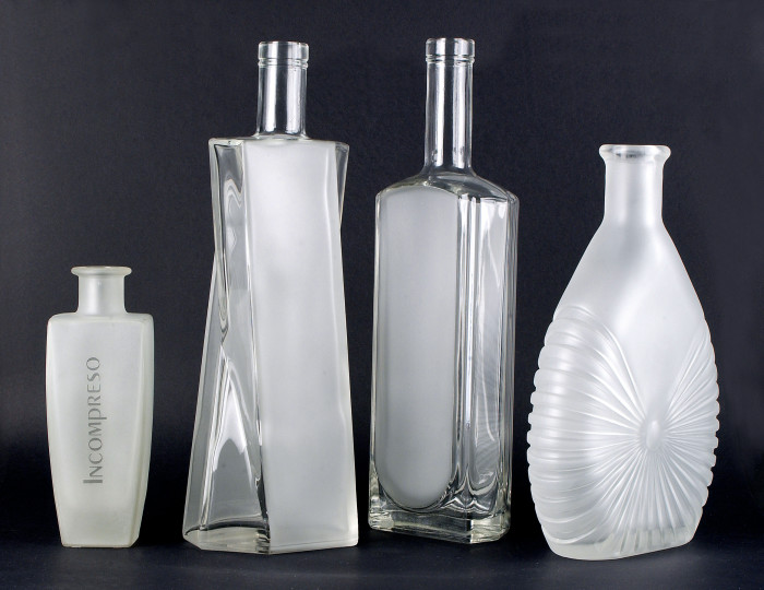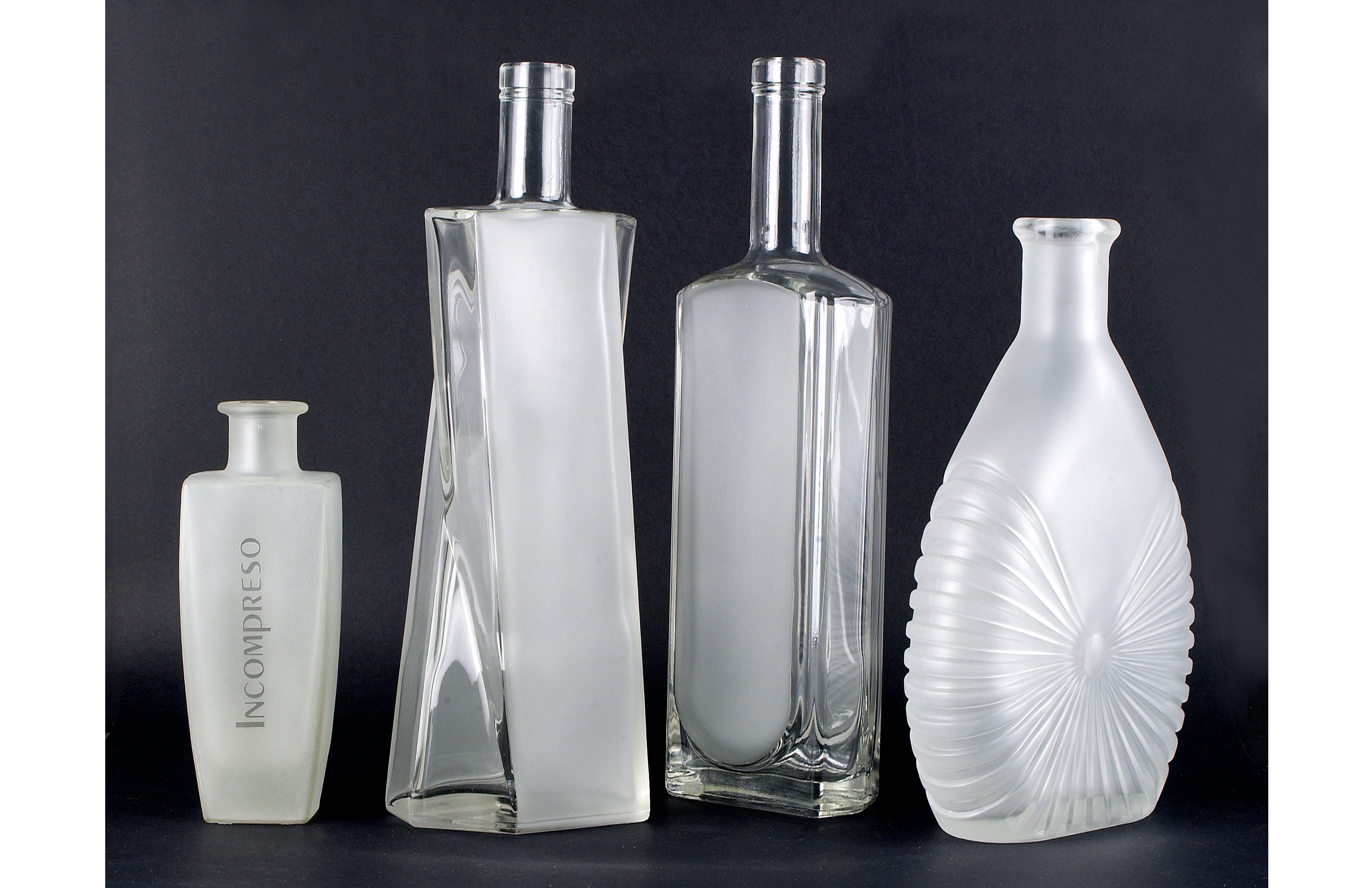 Flaconi con diversi gradi di satinatura: per il primo flacone a sinistra satinatura standard con nome del prodotto mantenuto nel colore del vetro; per i flaconi centrali satinature parziali; per il flacone a destra satinatura strong. Realizzazione P&P Promotion.